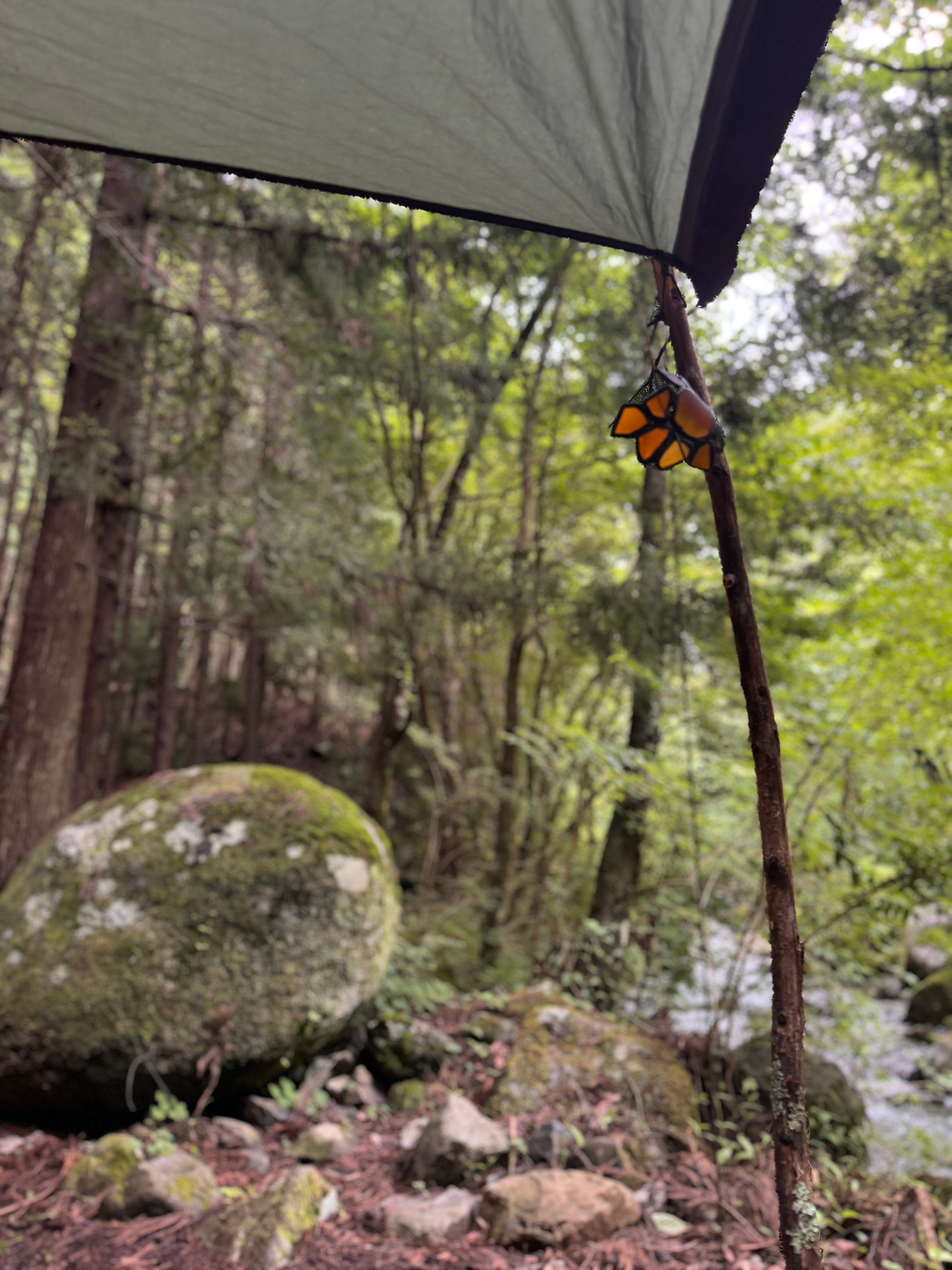 ・焚き火の前に枝やアイアンハンガーを差し、そこに下げて炎の灯りを透かして楽しむ。