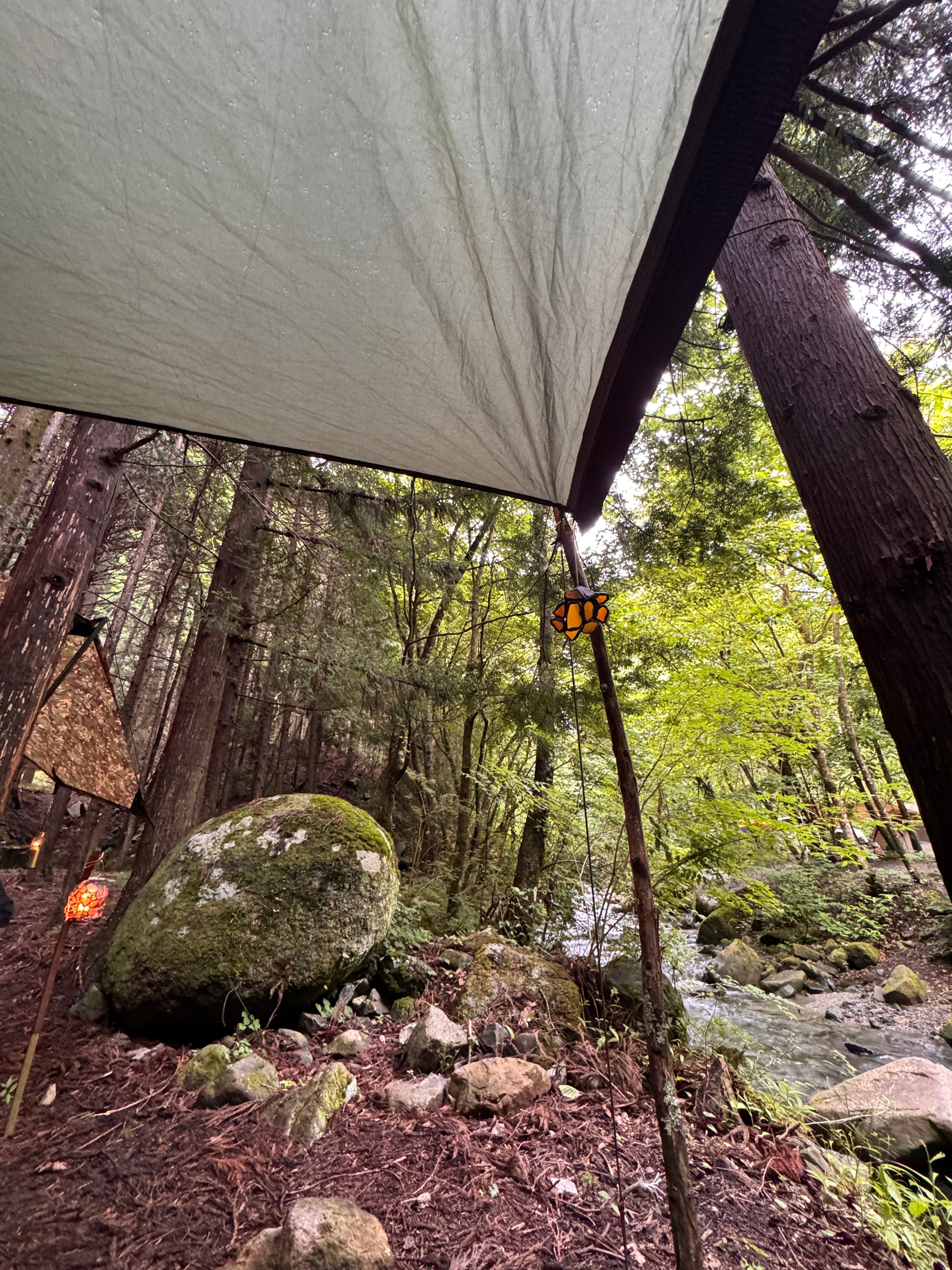・焚き火の前に枝やアイアンハンガーを差し、そこに下げて炎の灯りを透かして楽しむ。