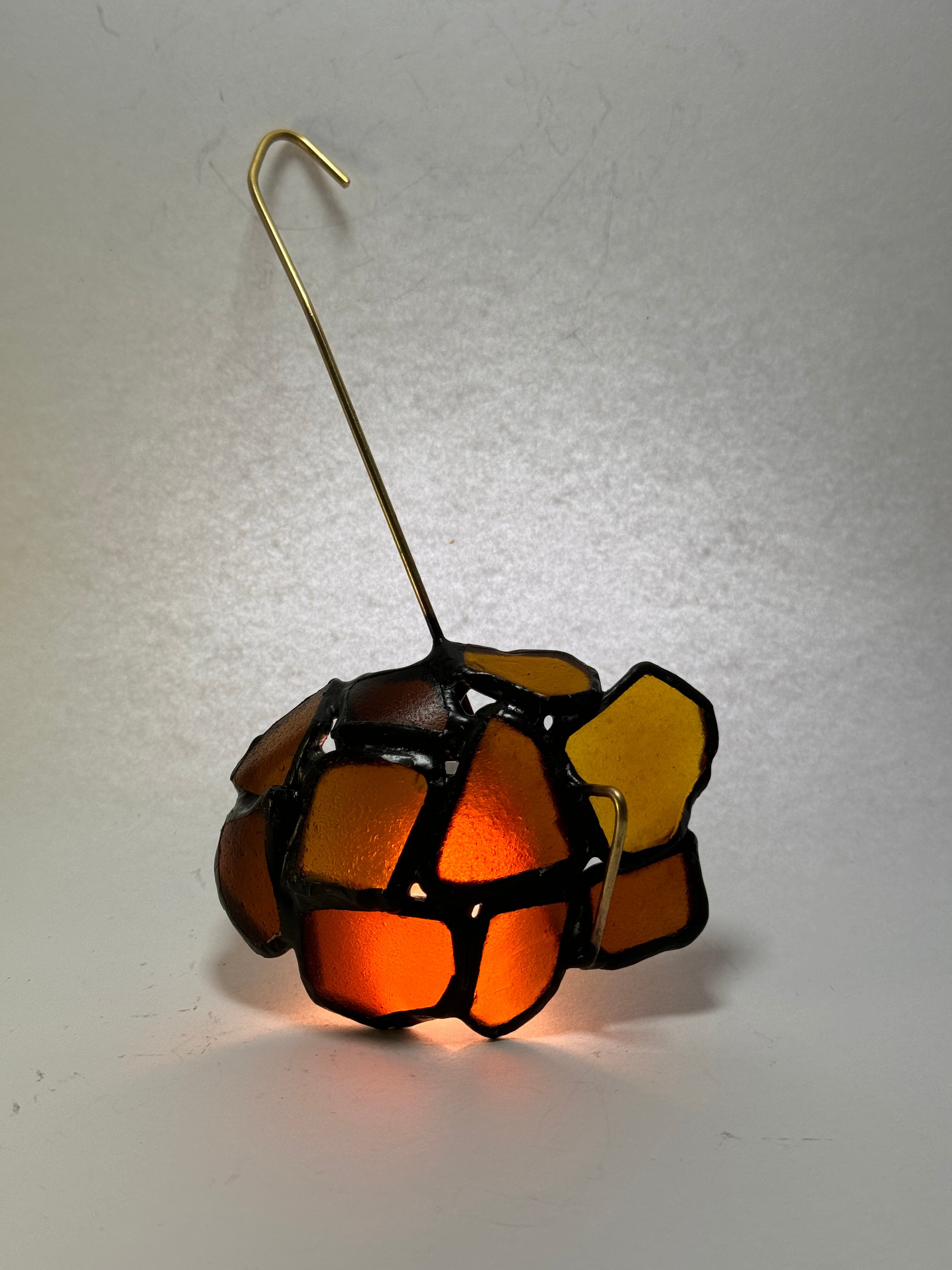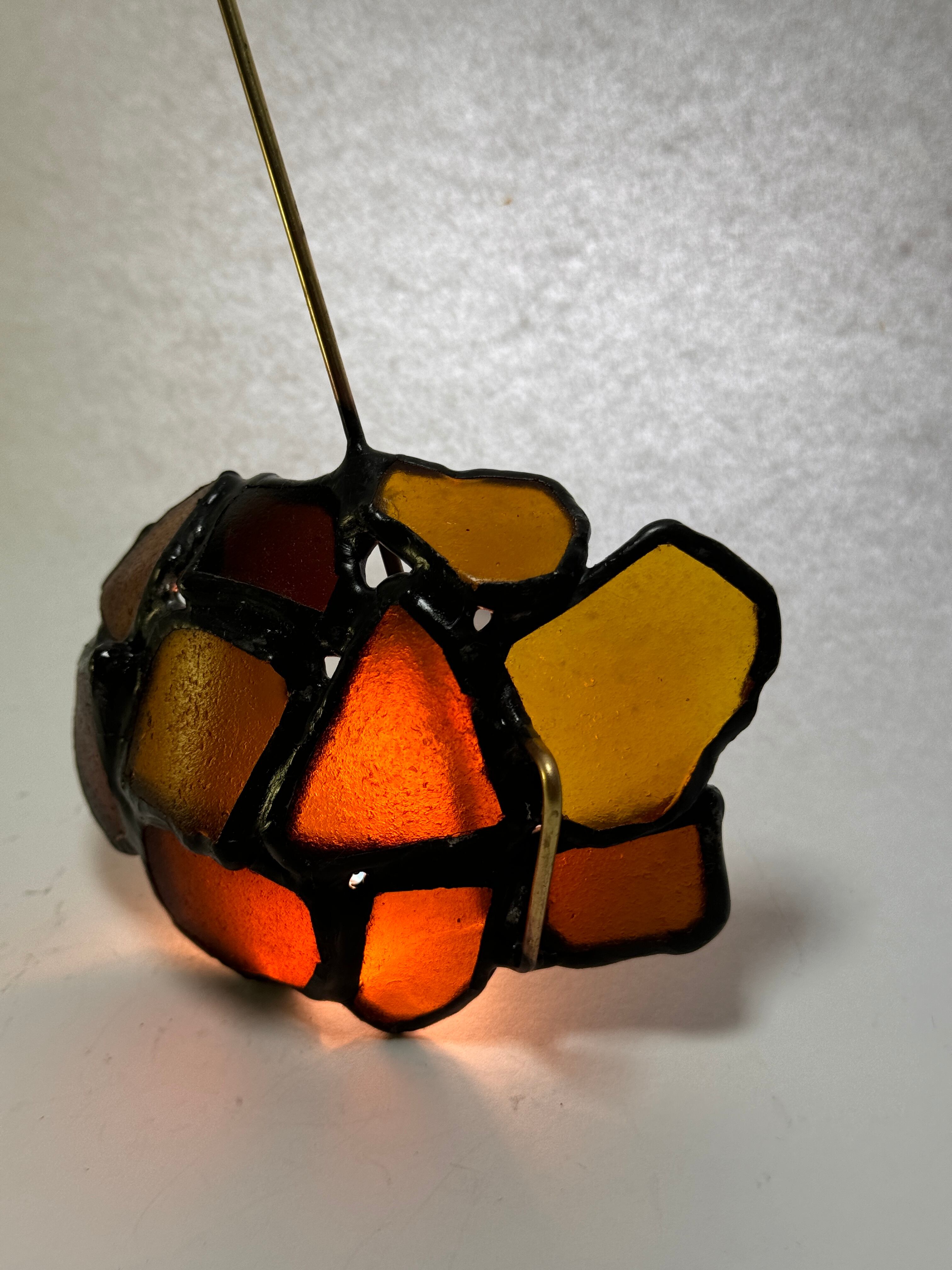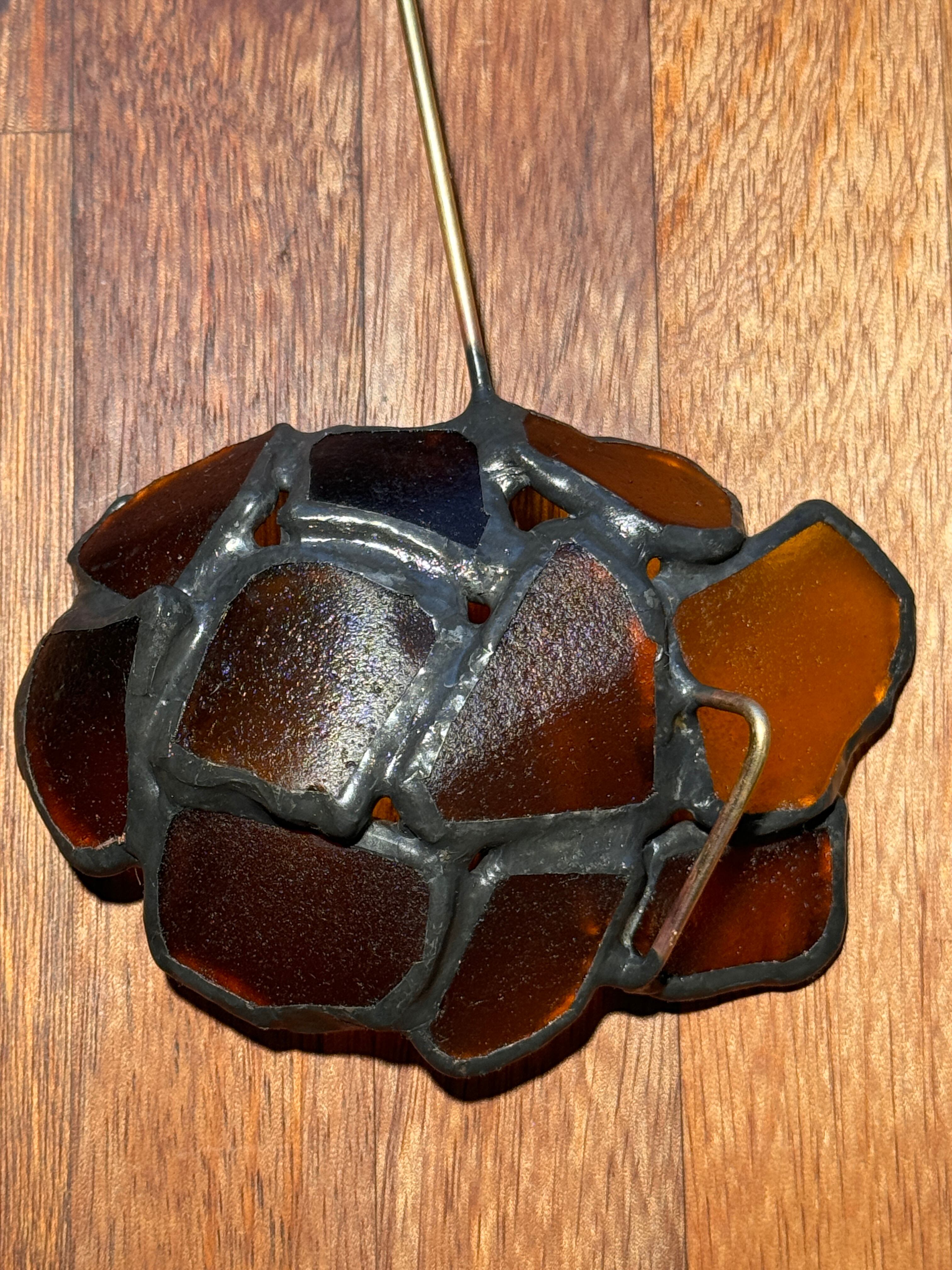 琥珀の飴玉の名の通り、琥珀色のブラウンシーグラスを10枚繋ぎ合わせて、真鍮の柄をつけました。