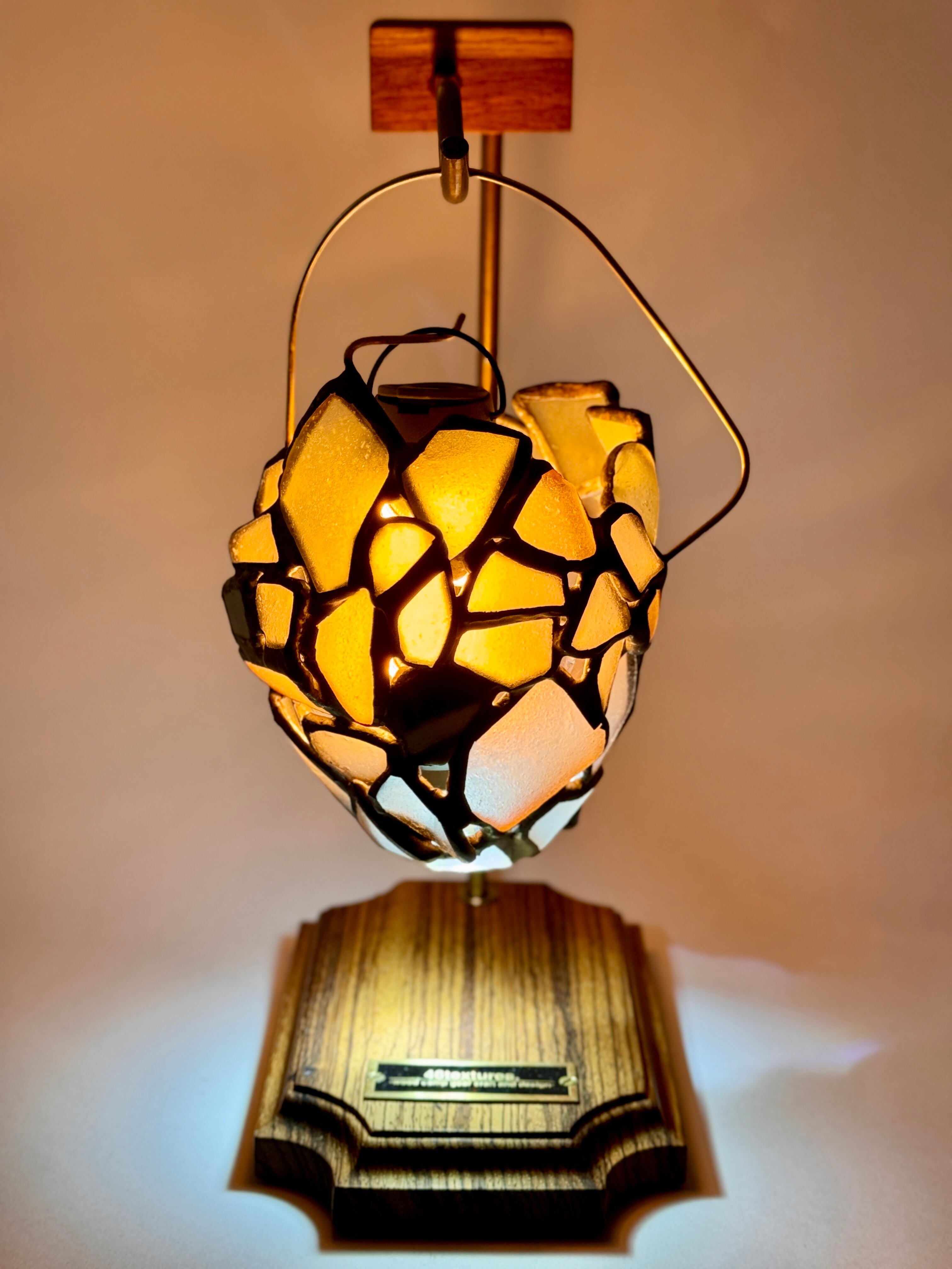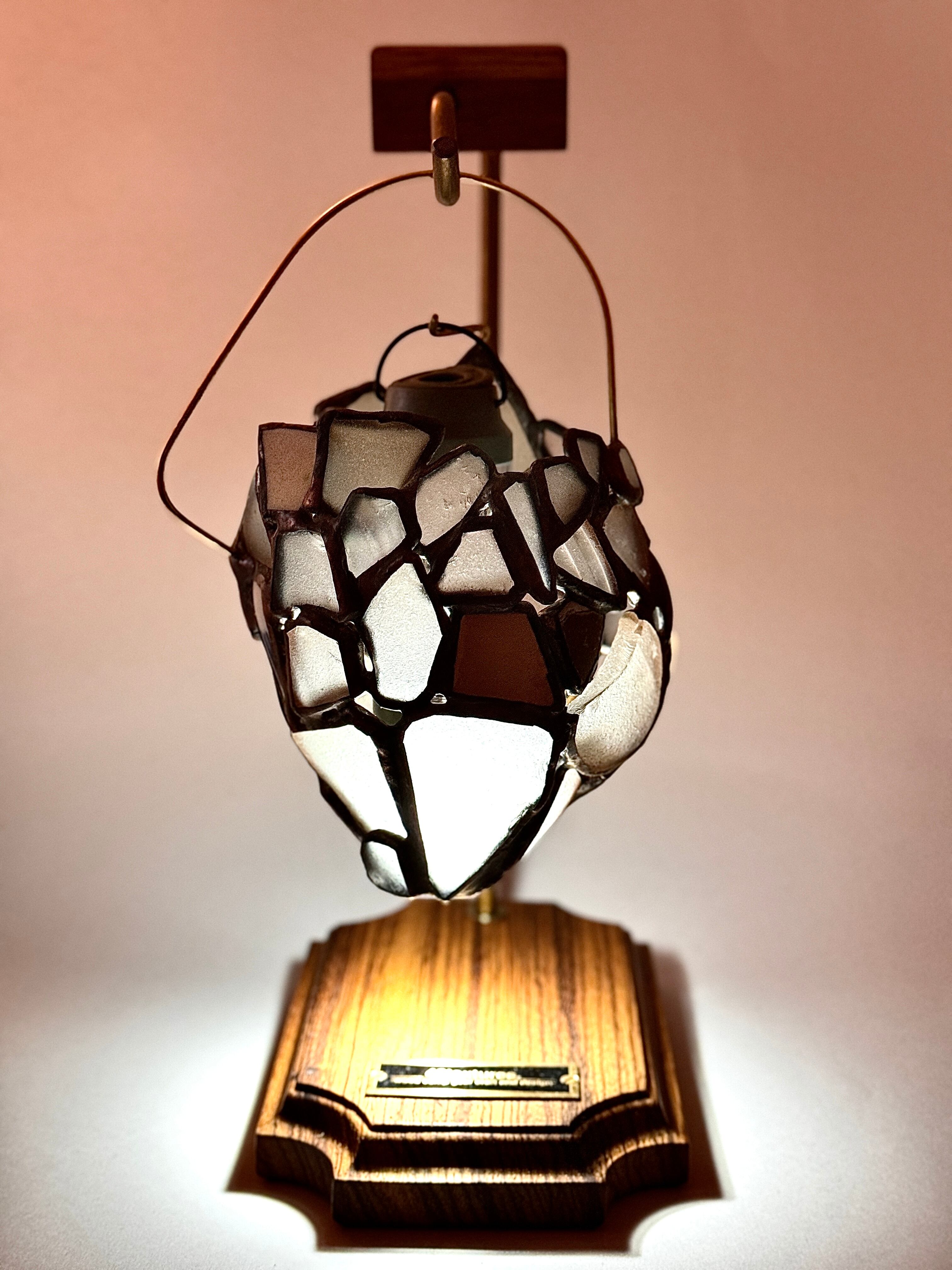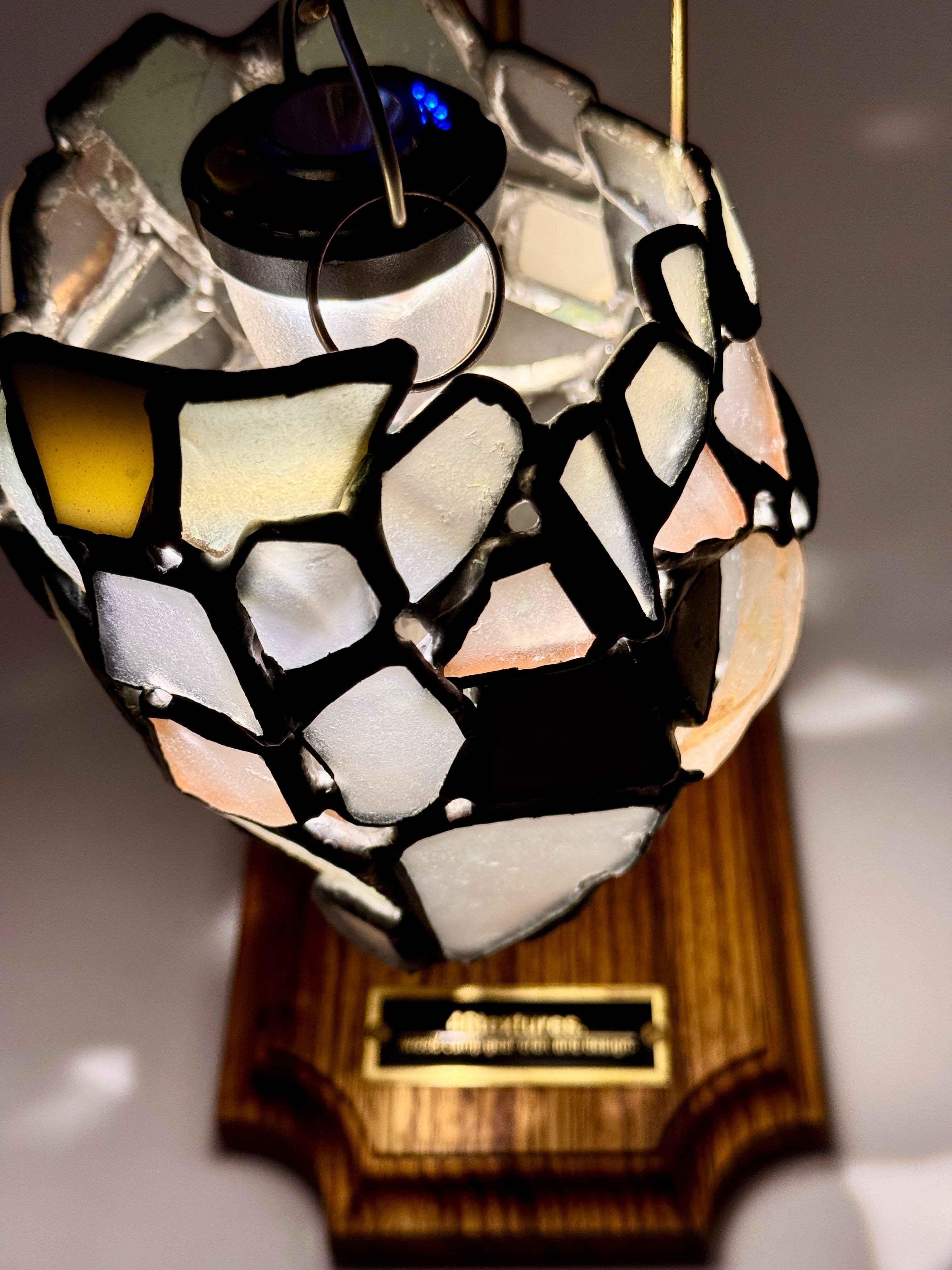 構成しているシーグラスの中に、6枚だけ陶器の破片を散りばめました。これは作者と作者の妻が実際に千葉の砂浜で拾ったものを使っています。陶器とはいえ、これもシーグラス同様長い年月をかけて潮と砂に揉まれてきているため、なんとも言えない風合いがあります。