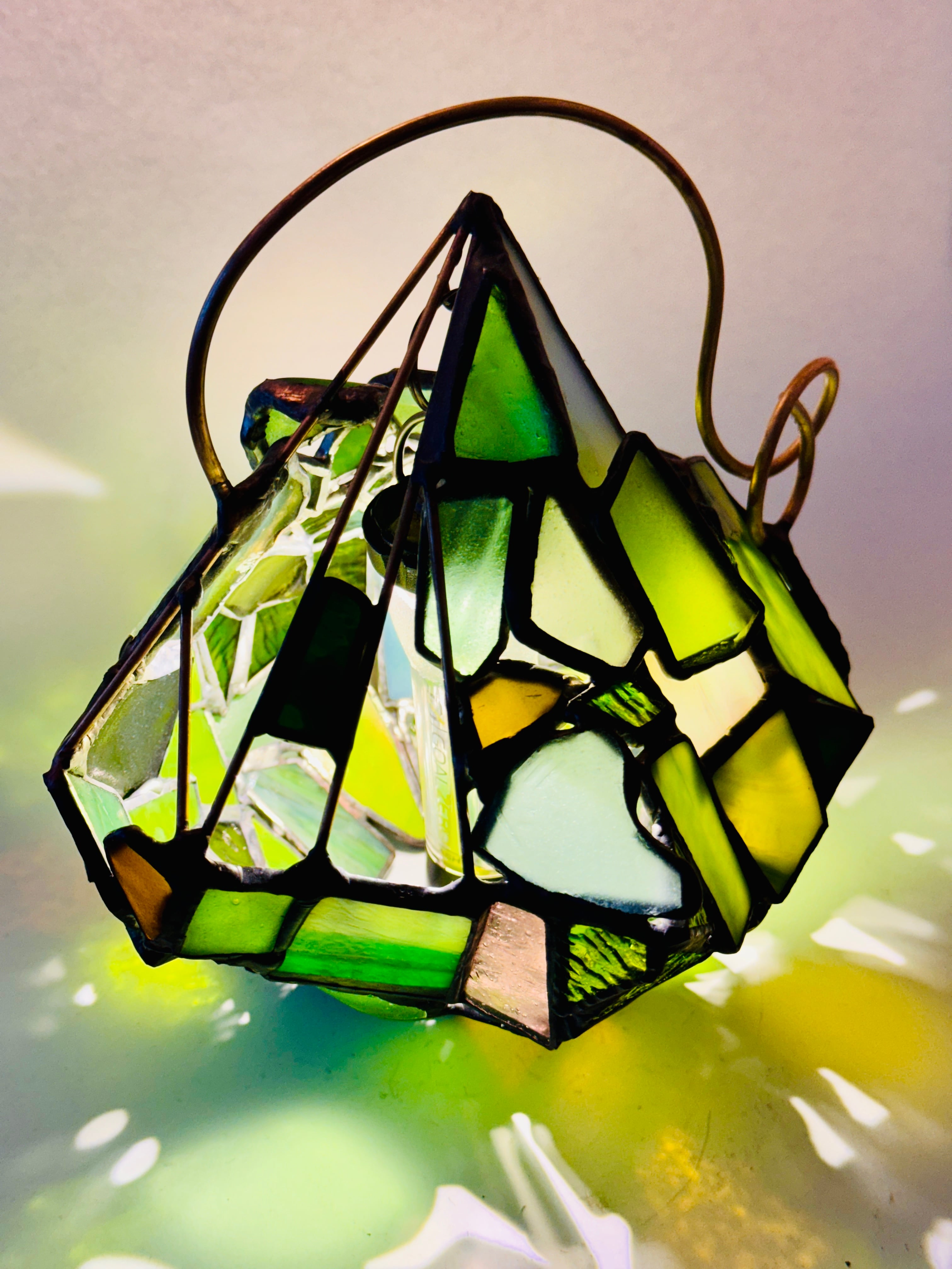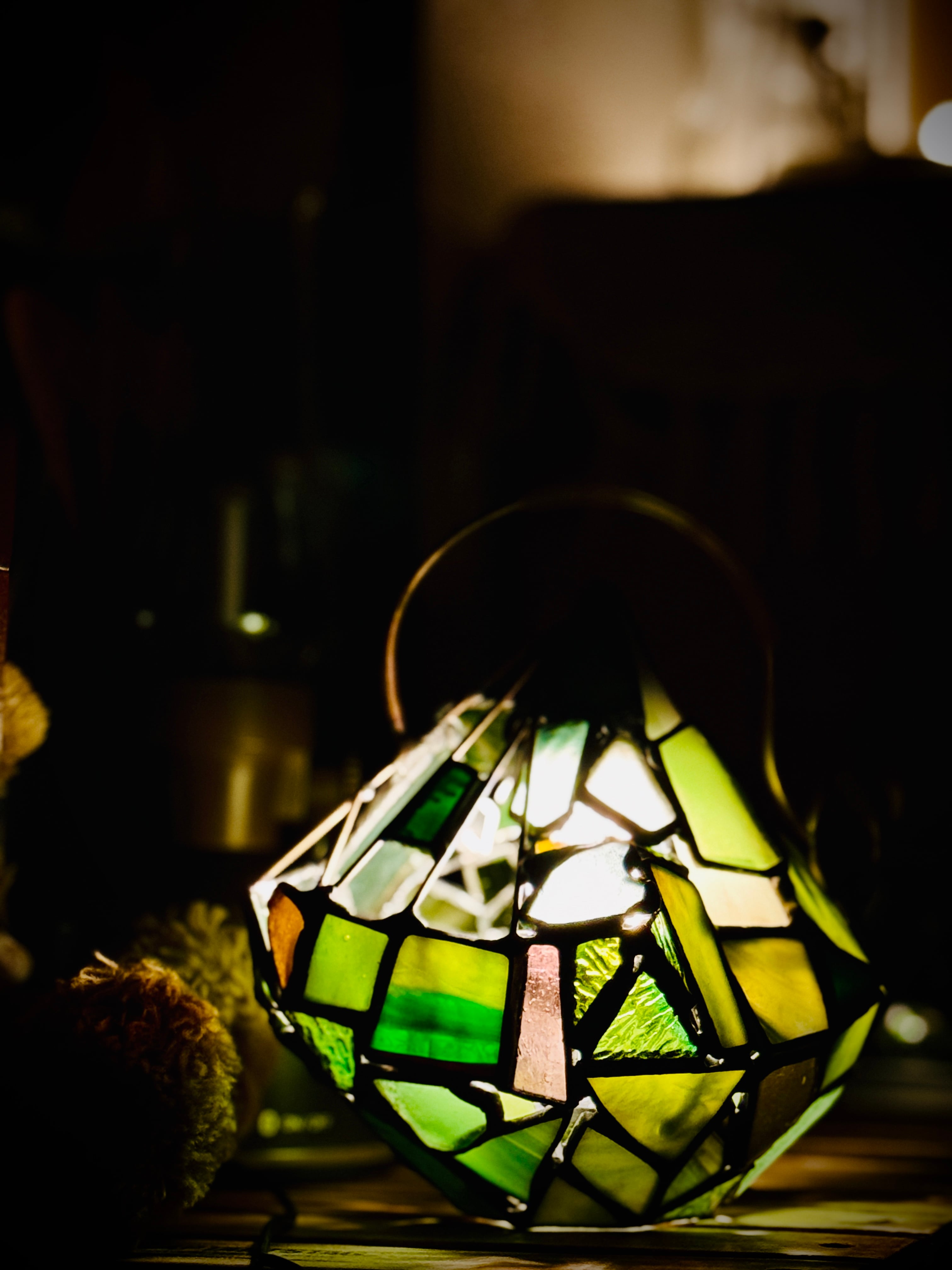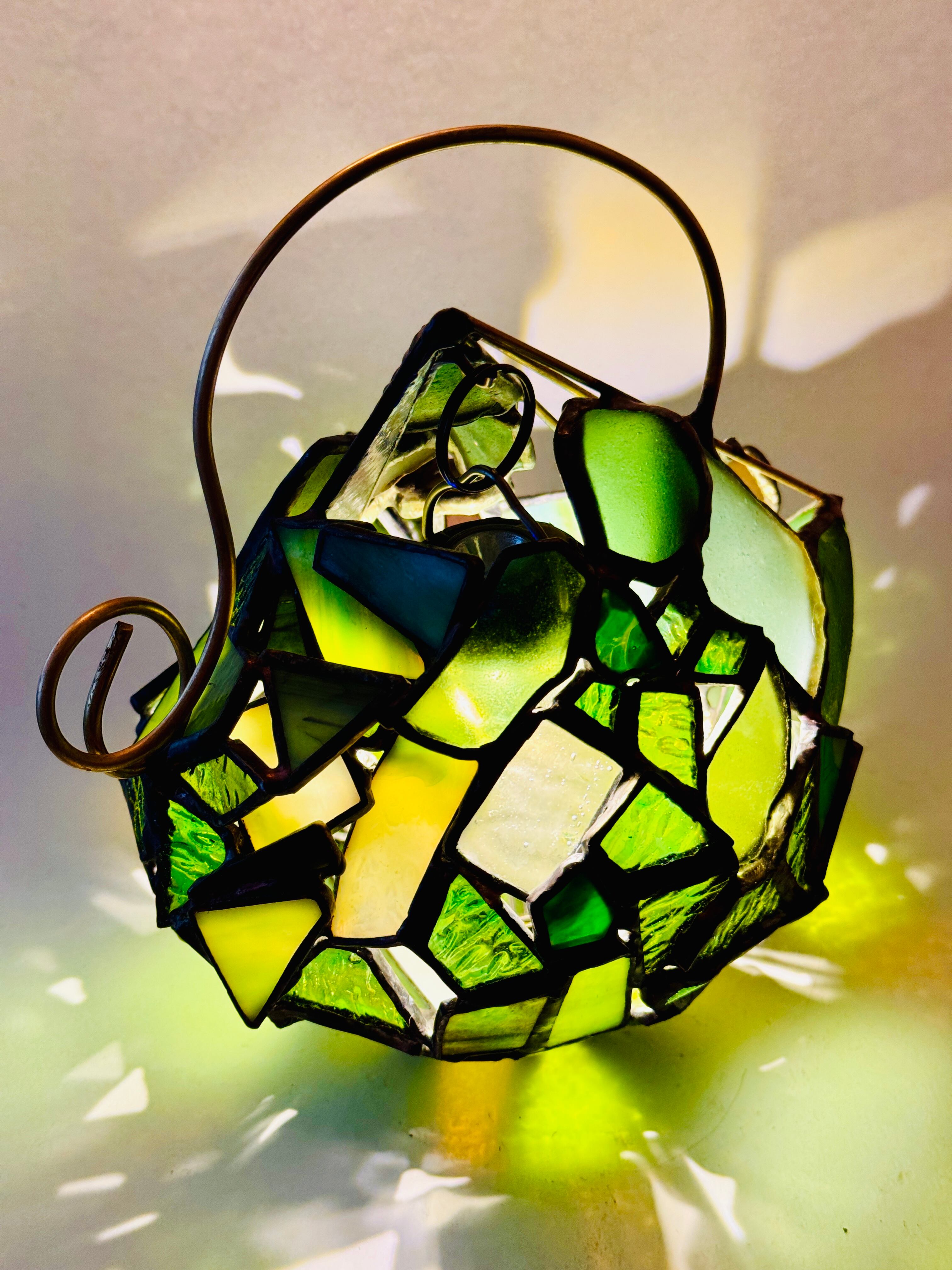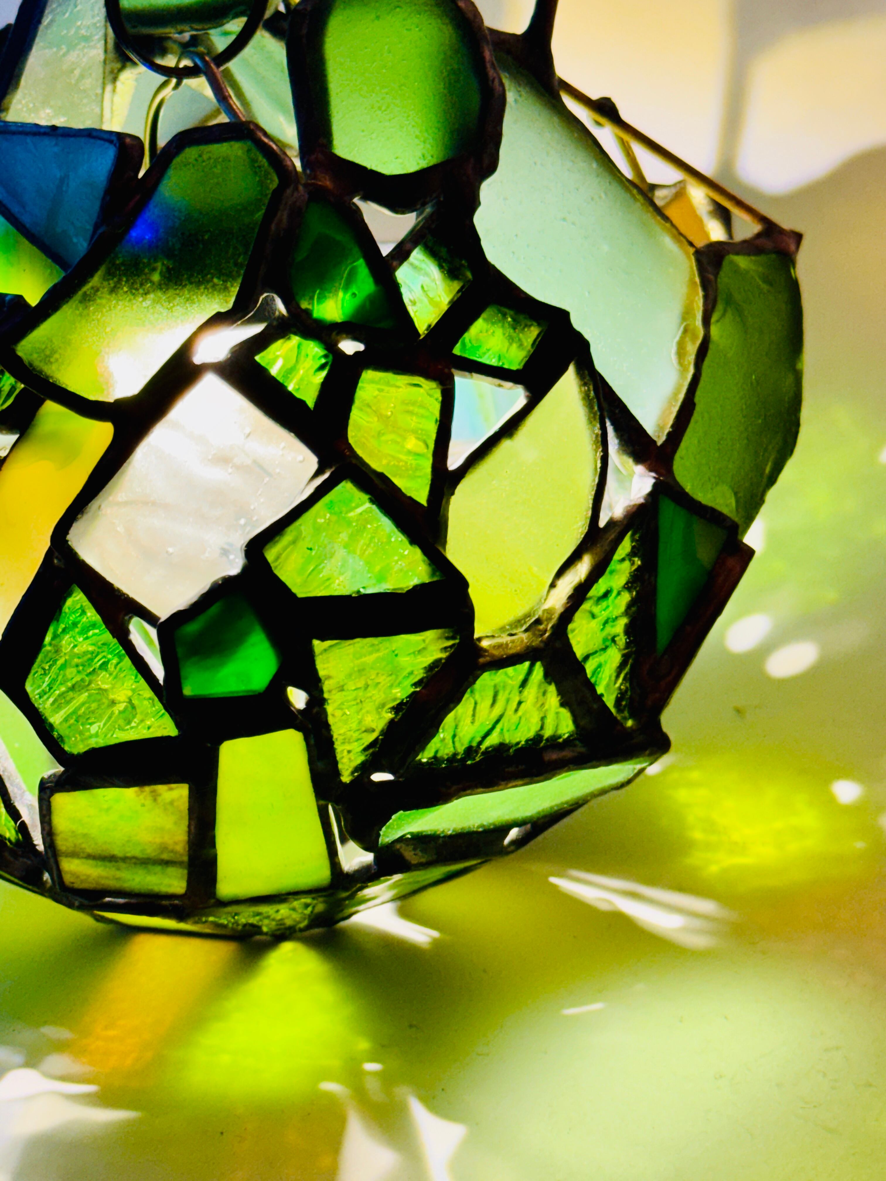 ハンダはアンティーク調で渋めに、ガラスの所々には緑色のシーグラスをあしらっています。