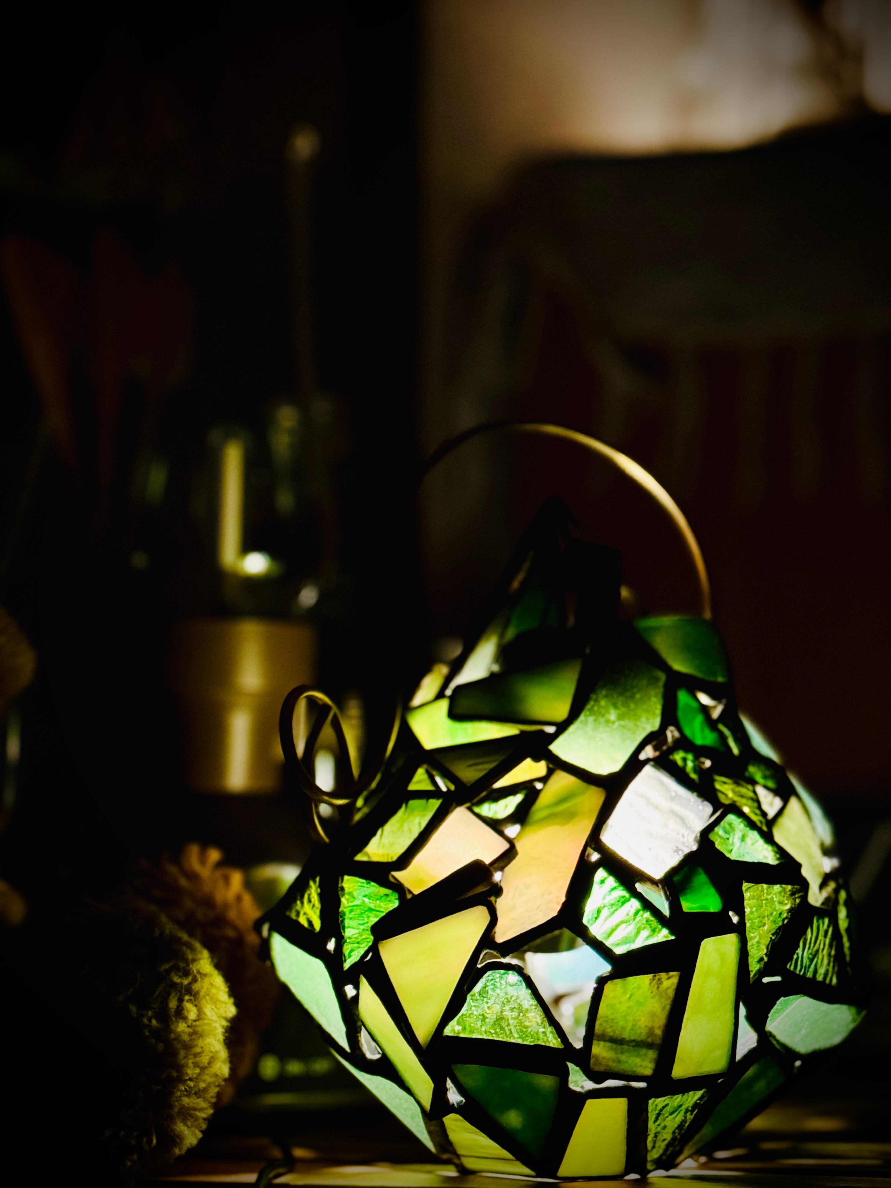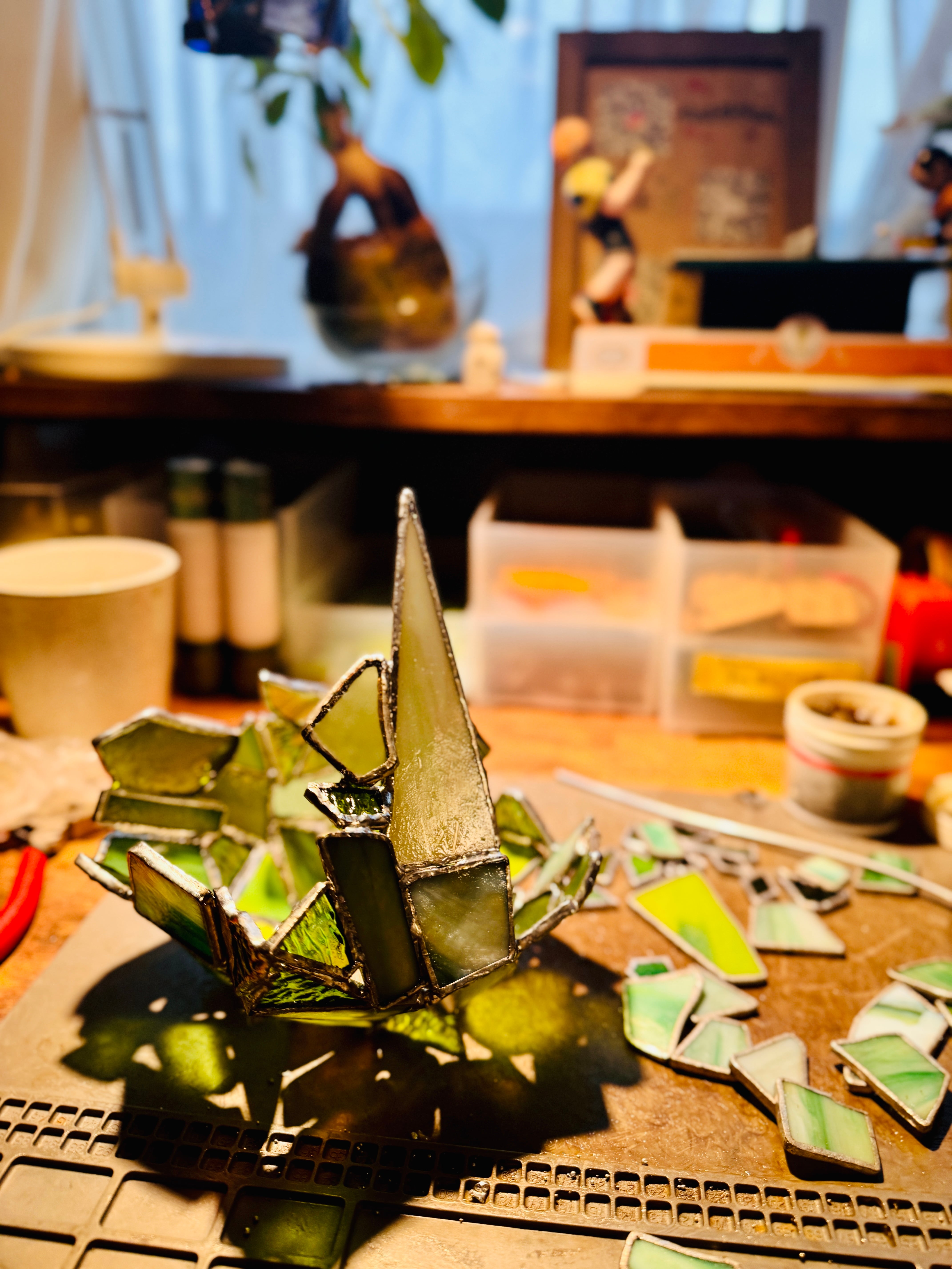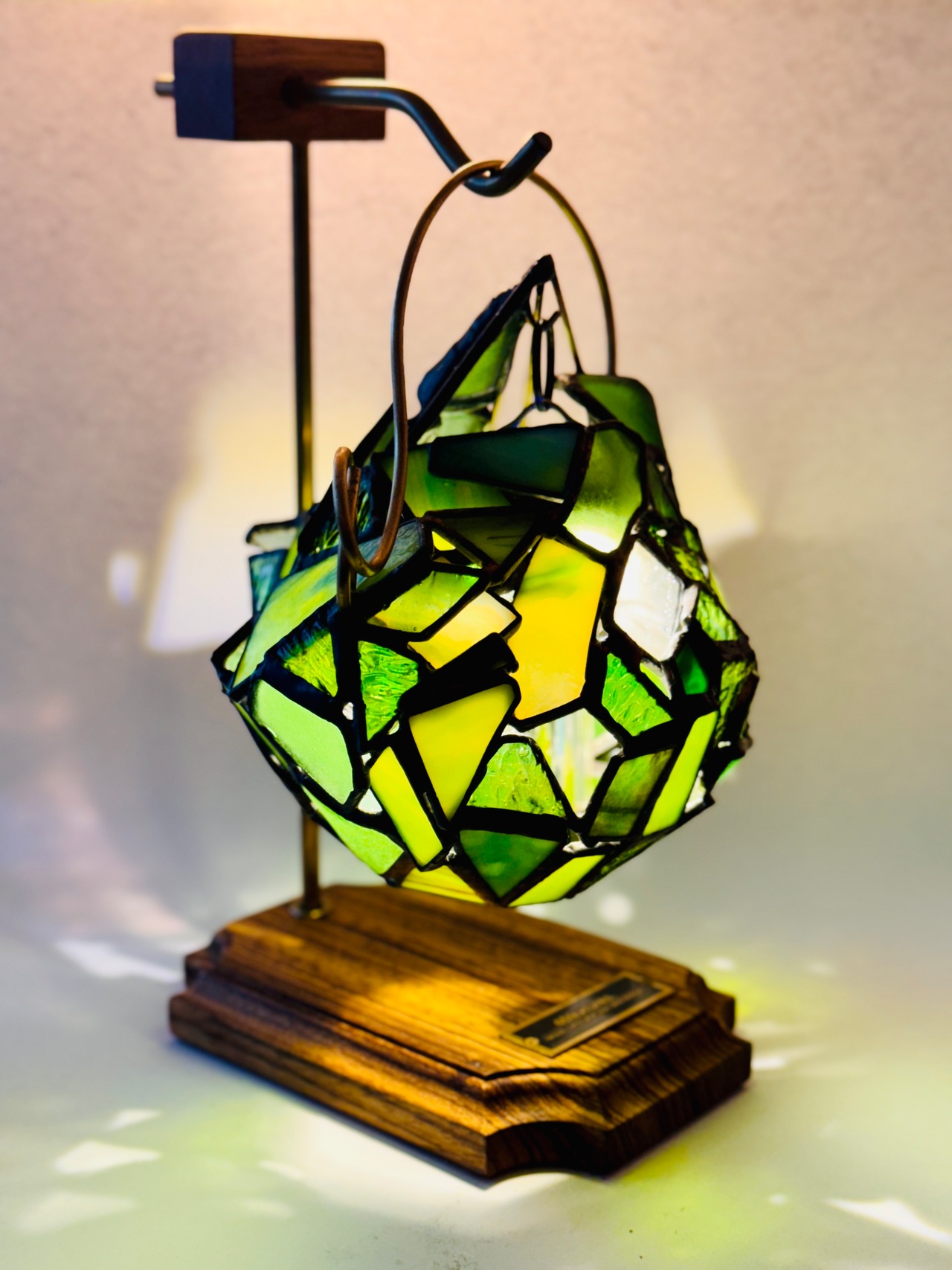 ハンダはアンティーク調で渋めに、ガラスの所々には緑色のシーグラスをあしらっています。