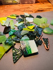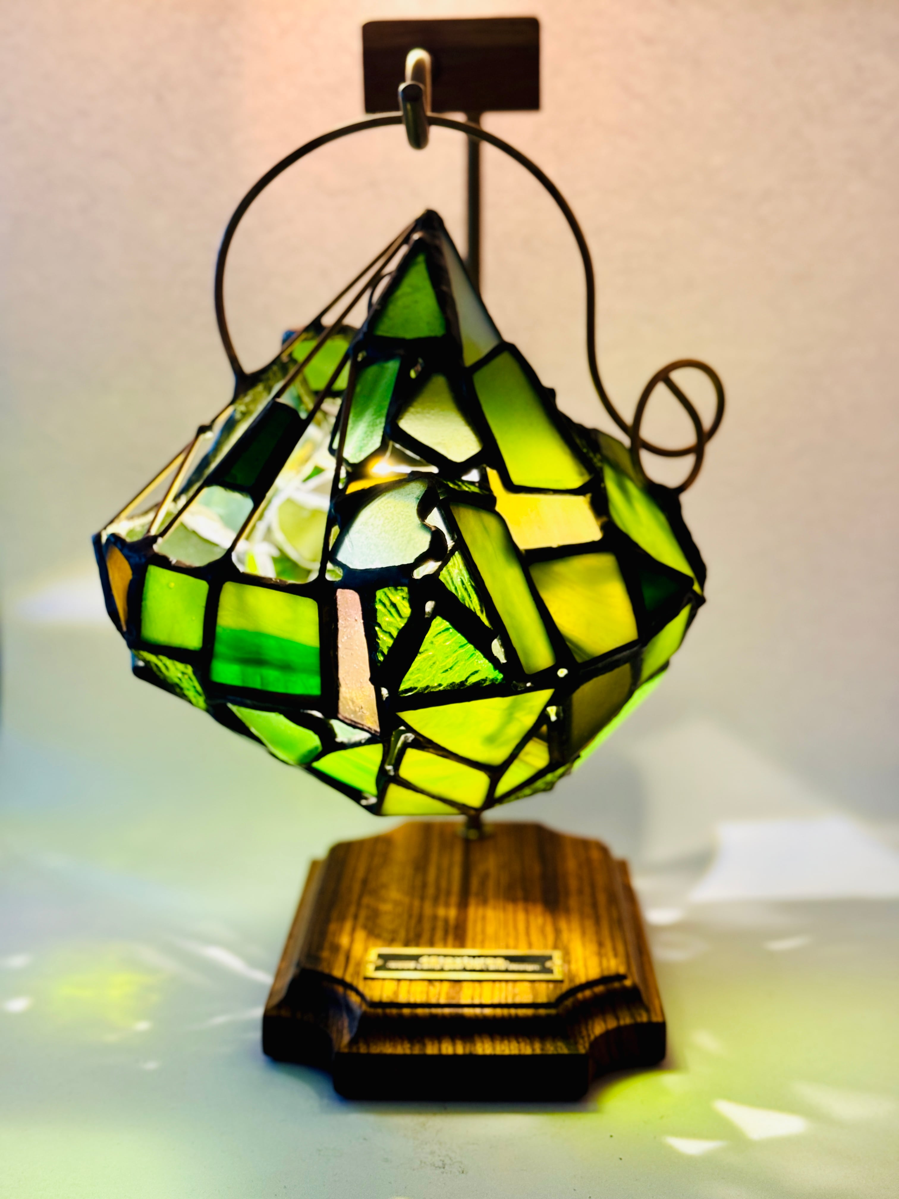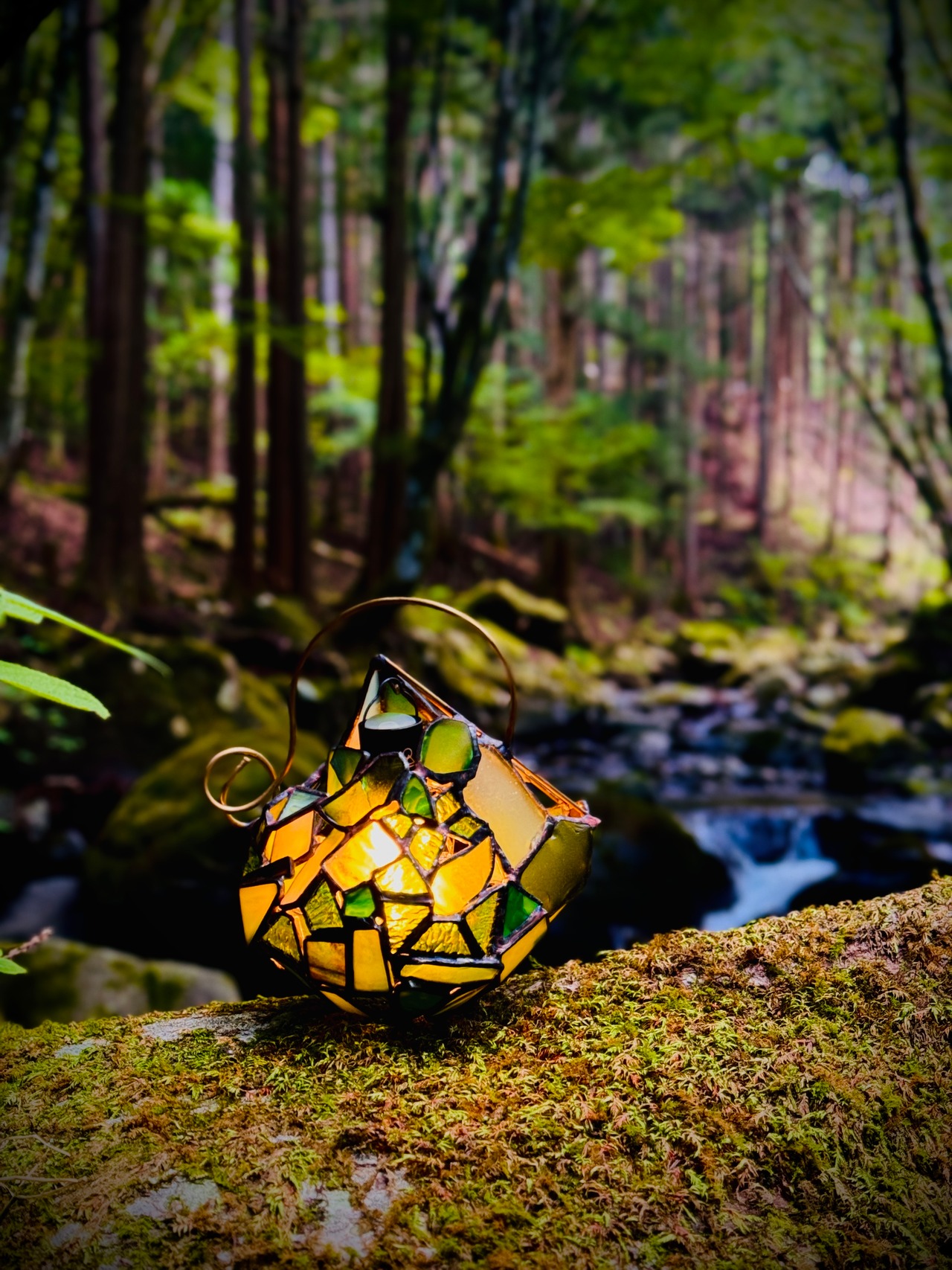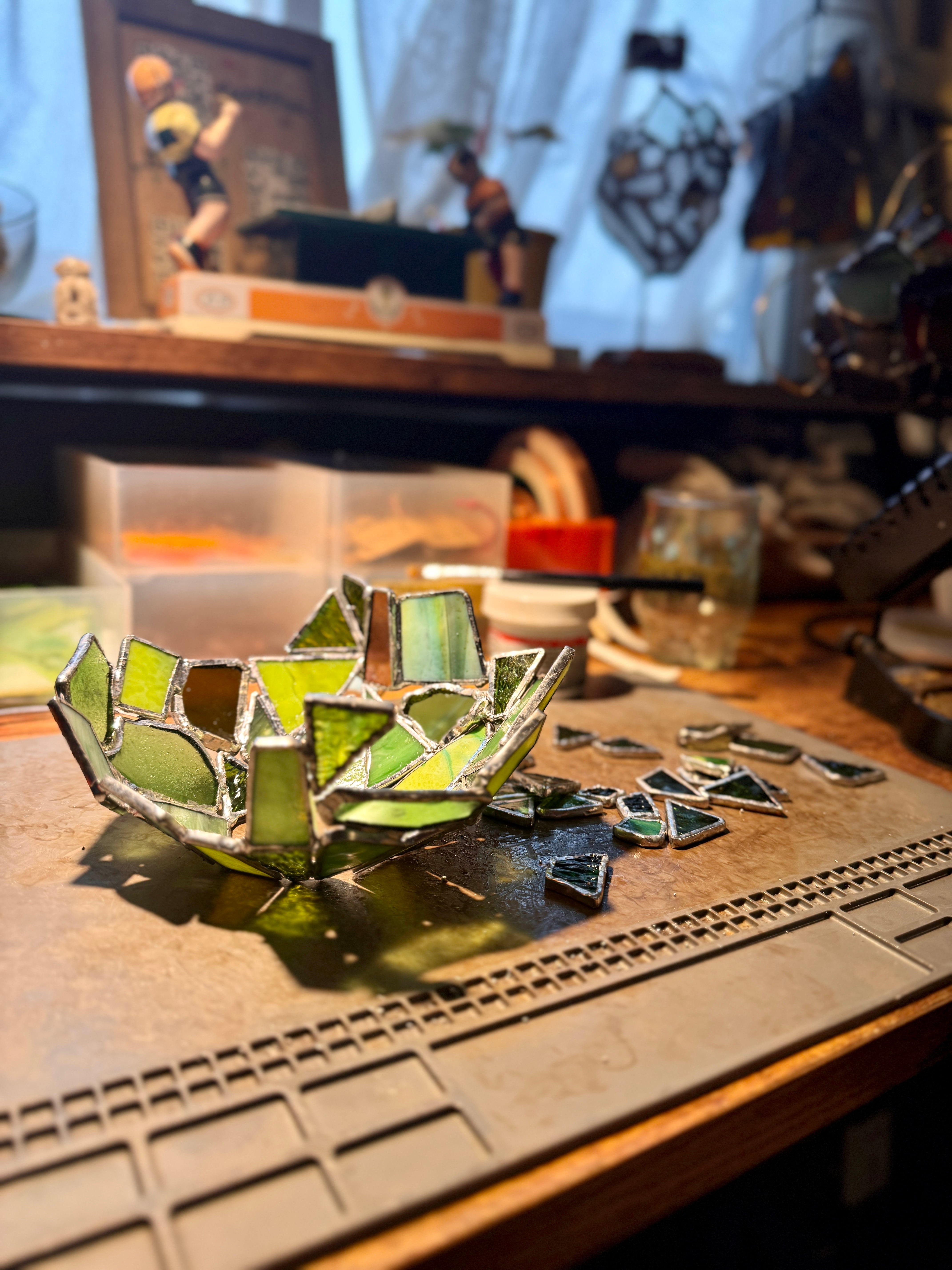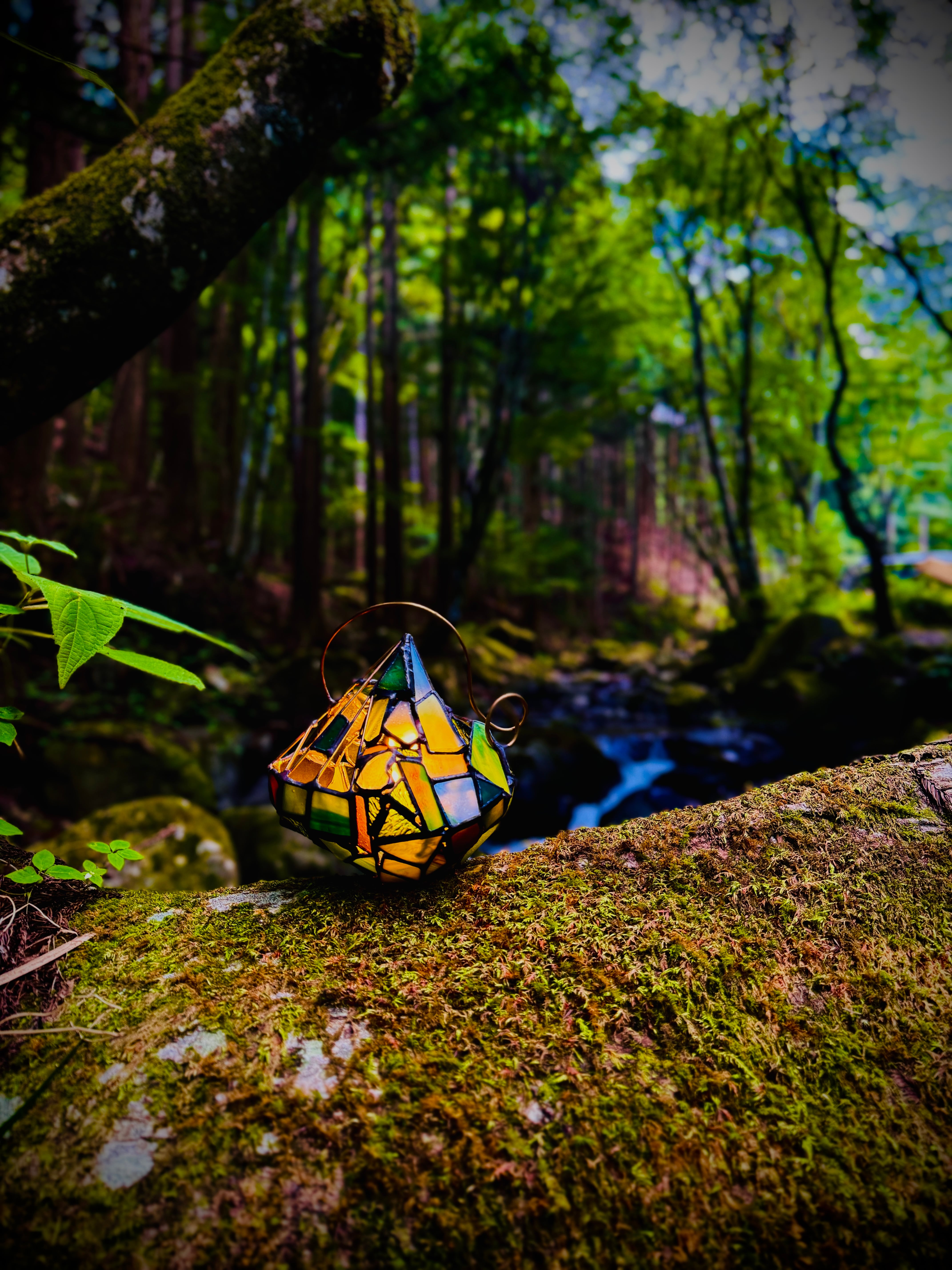 ハンダはアンティーク調で渋めに、ガラスの所々には緑色のシーグラスをあしらっています。