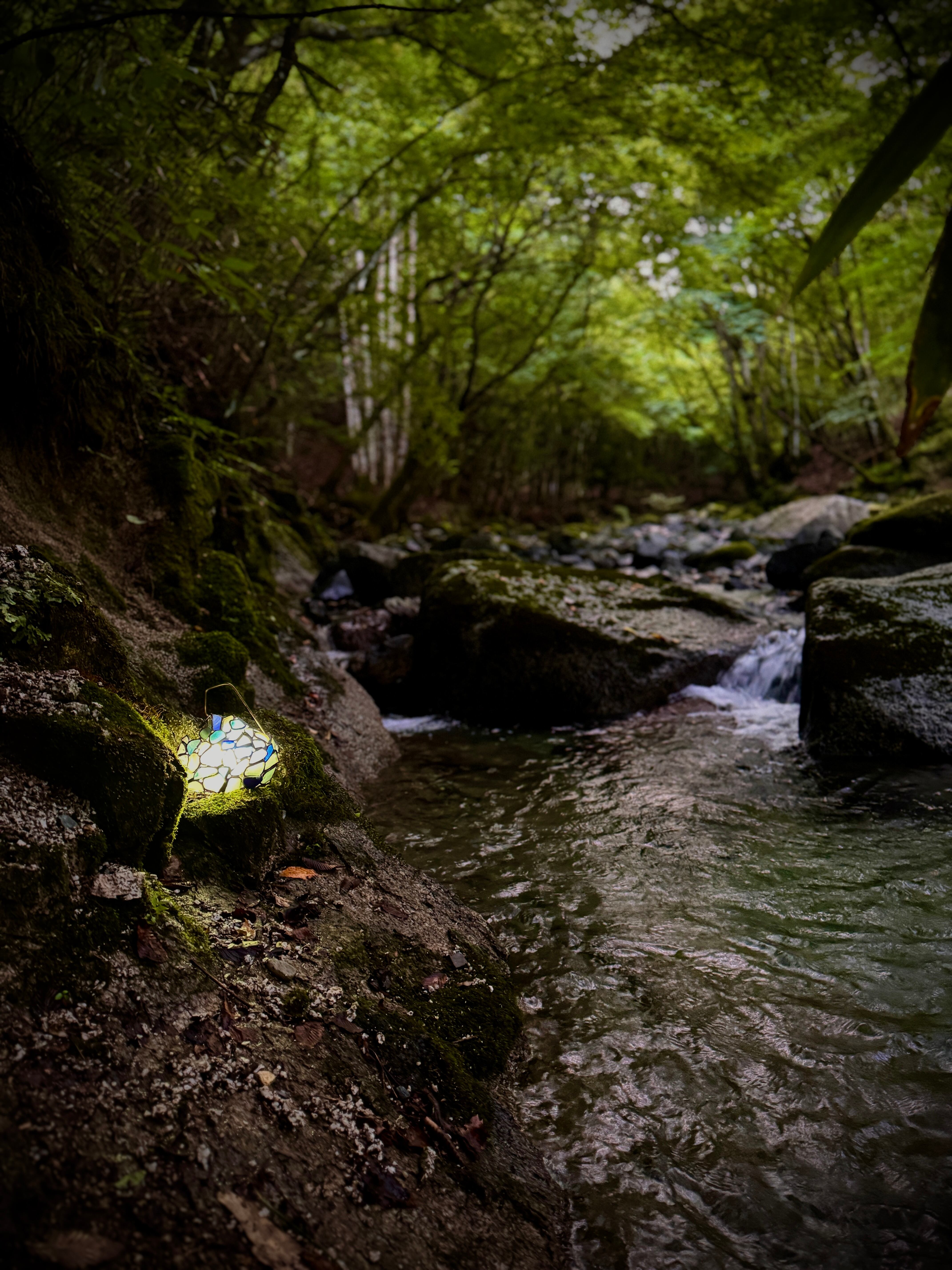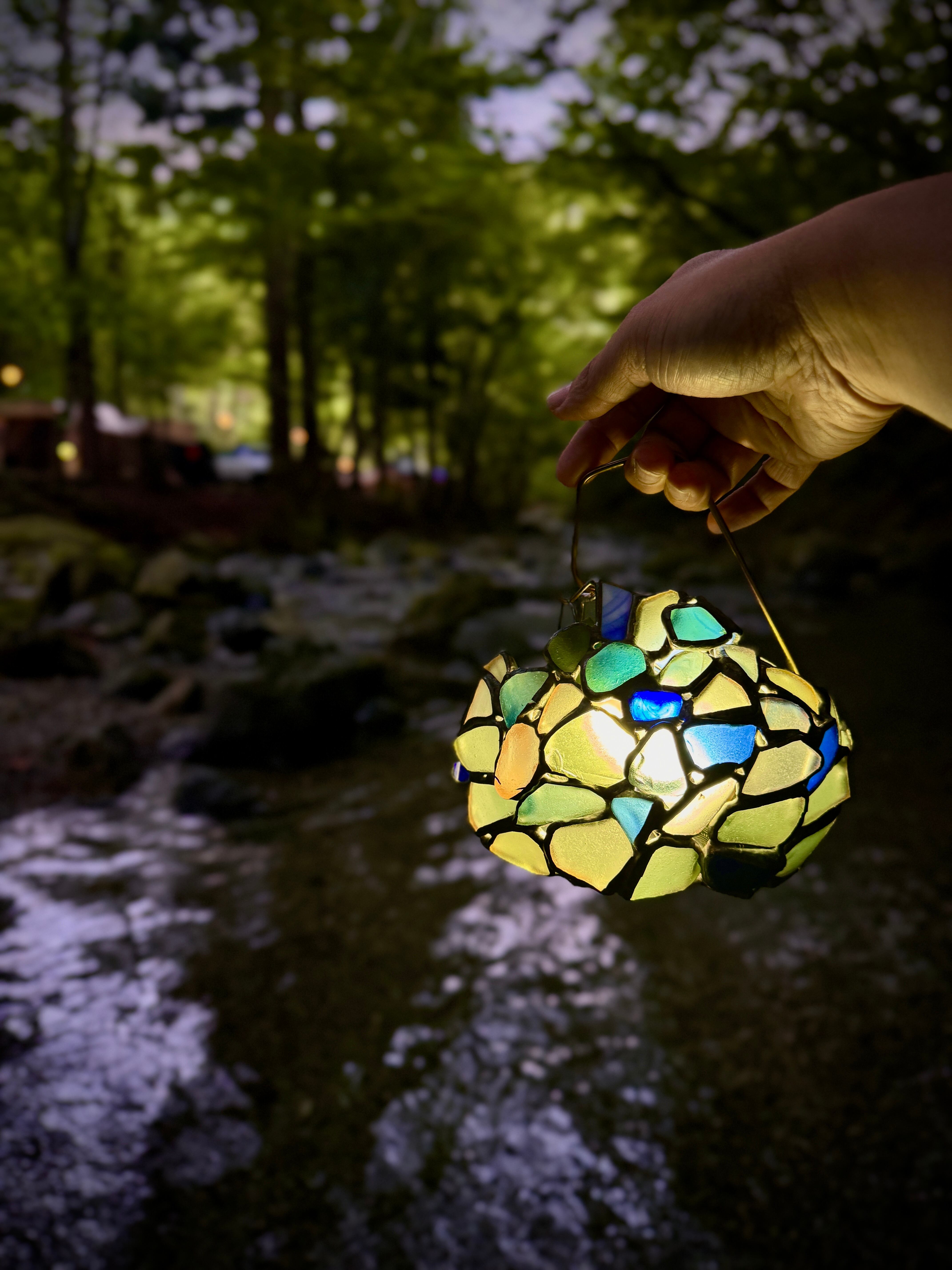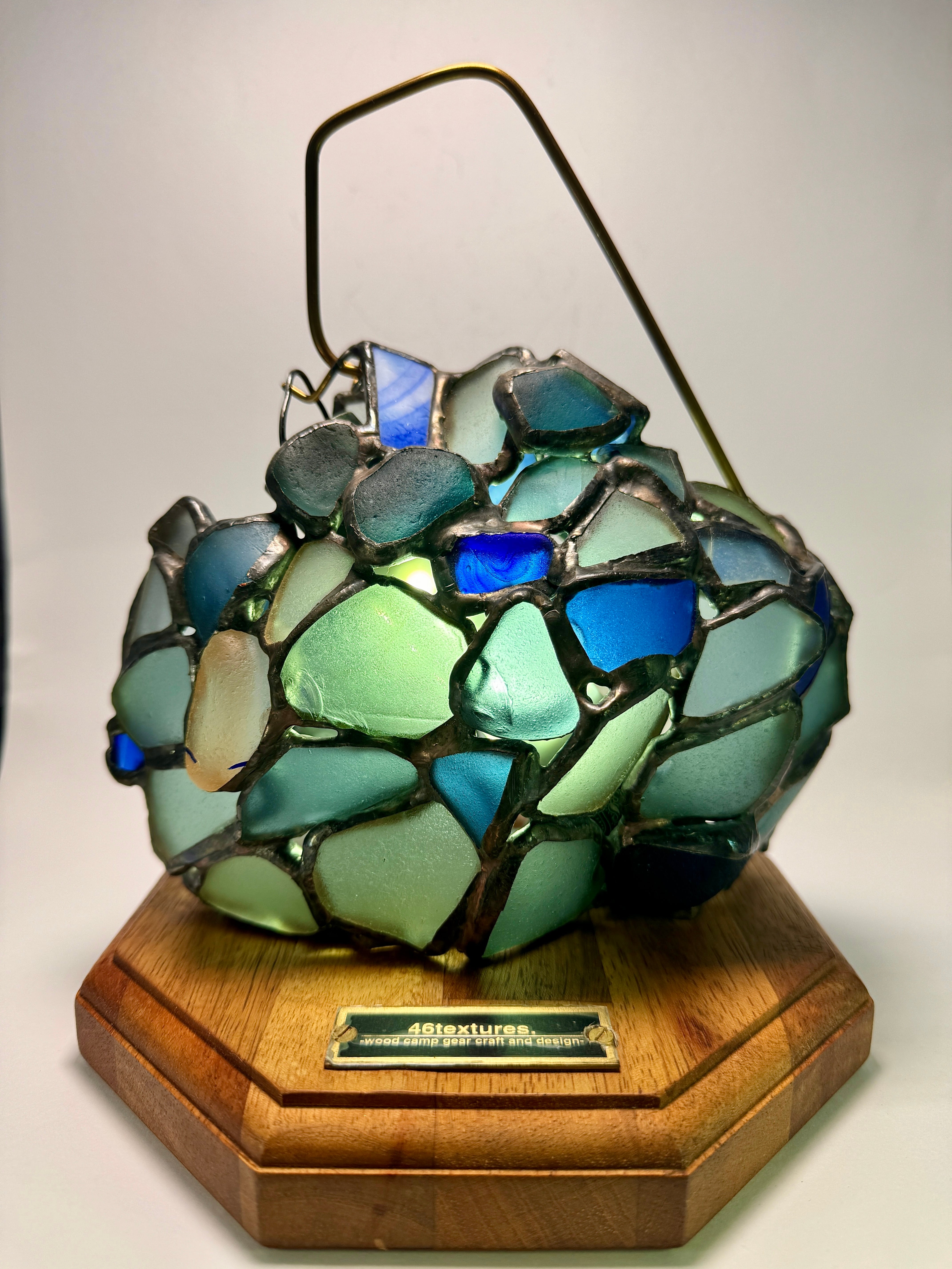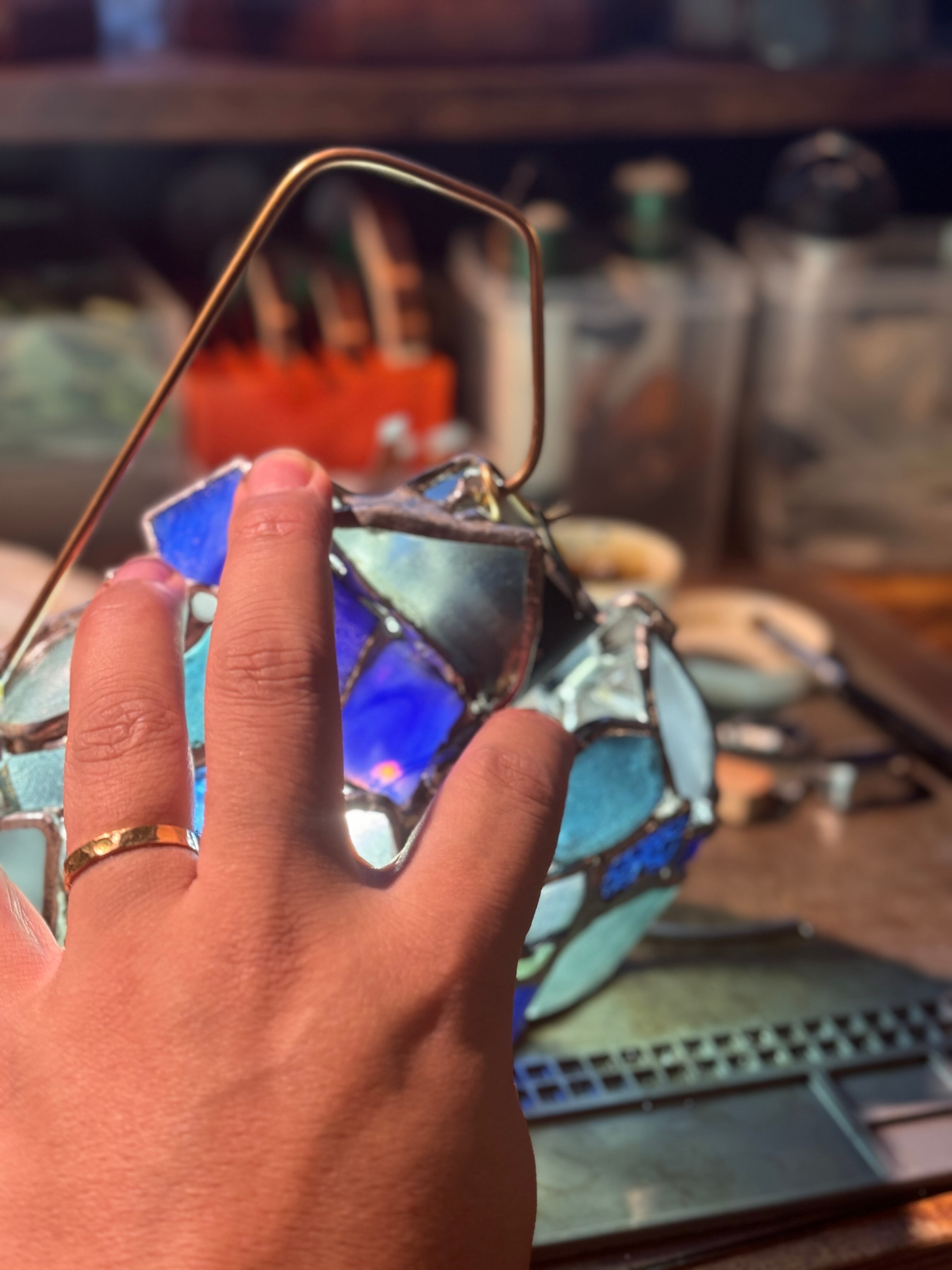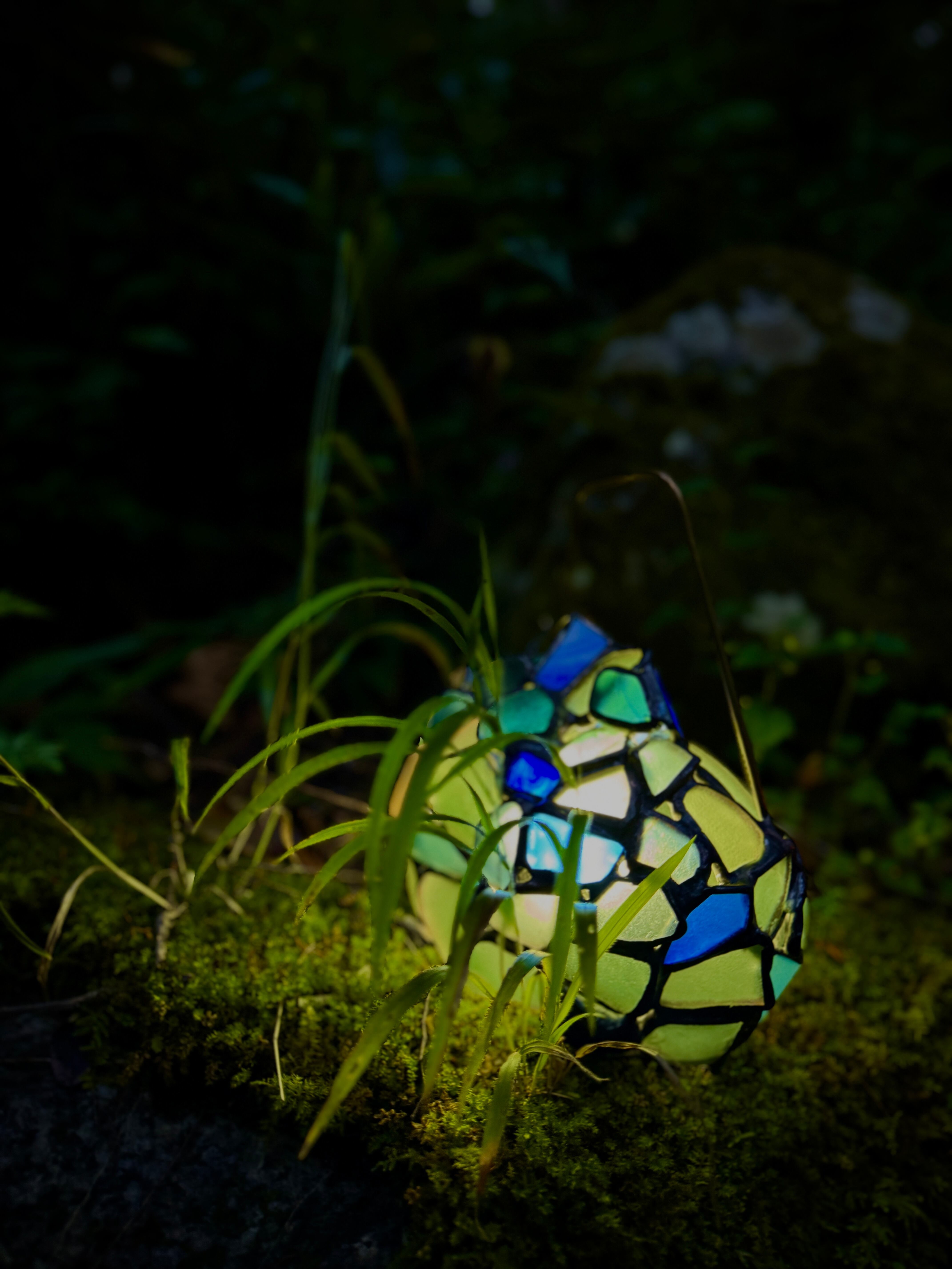 タイトルの”渚”は、7月に夫婦で行った佐渡島の二ツ亀の海をイメージして名付けました。空の青を思いきり吸い込んだ、佐渡屈指の透明度の高い海は、言葉にできない美しさがありました。言葉にできないならと、その二ツ亀海水浴場の砂浜に優しく寄せる波の癒しをステンドグラスで表現しました。耳を当てると、あの時の波と風の音が聞こえてきそうです。そんな夏の癒しの情景がランタンの灯りで浮かび上がるといいなという思いを込めてます。