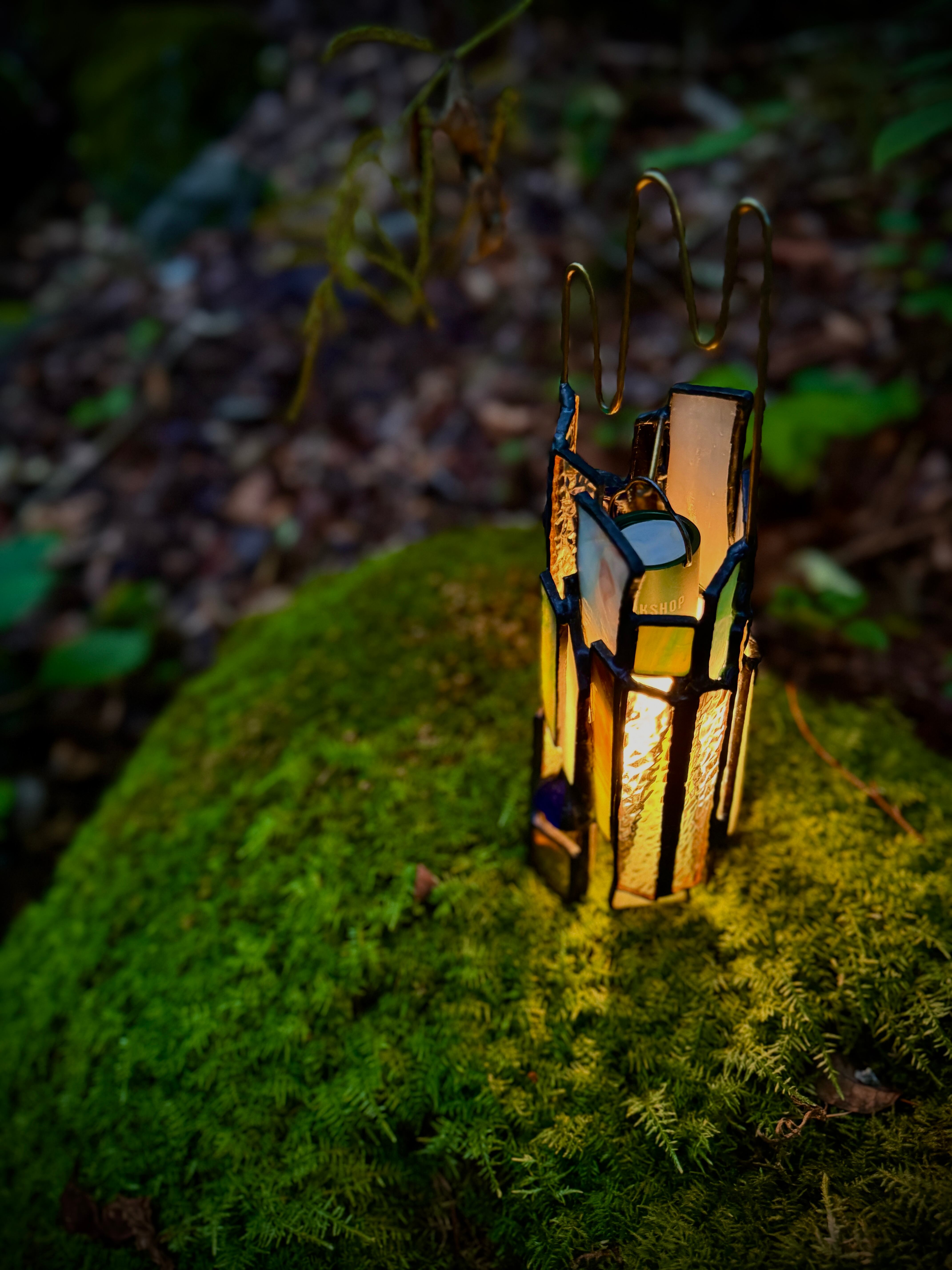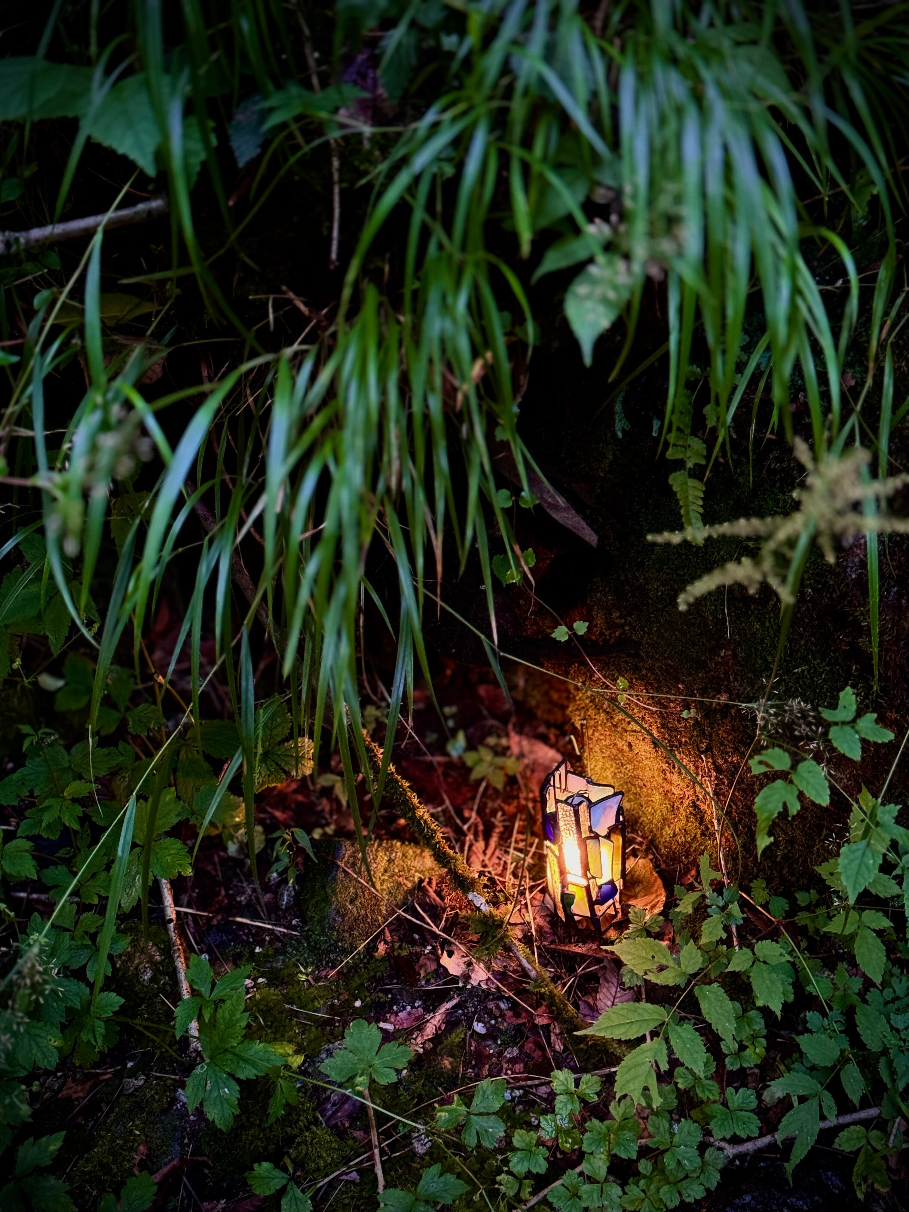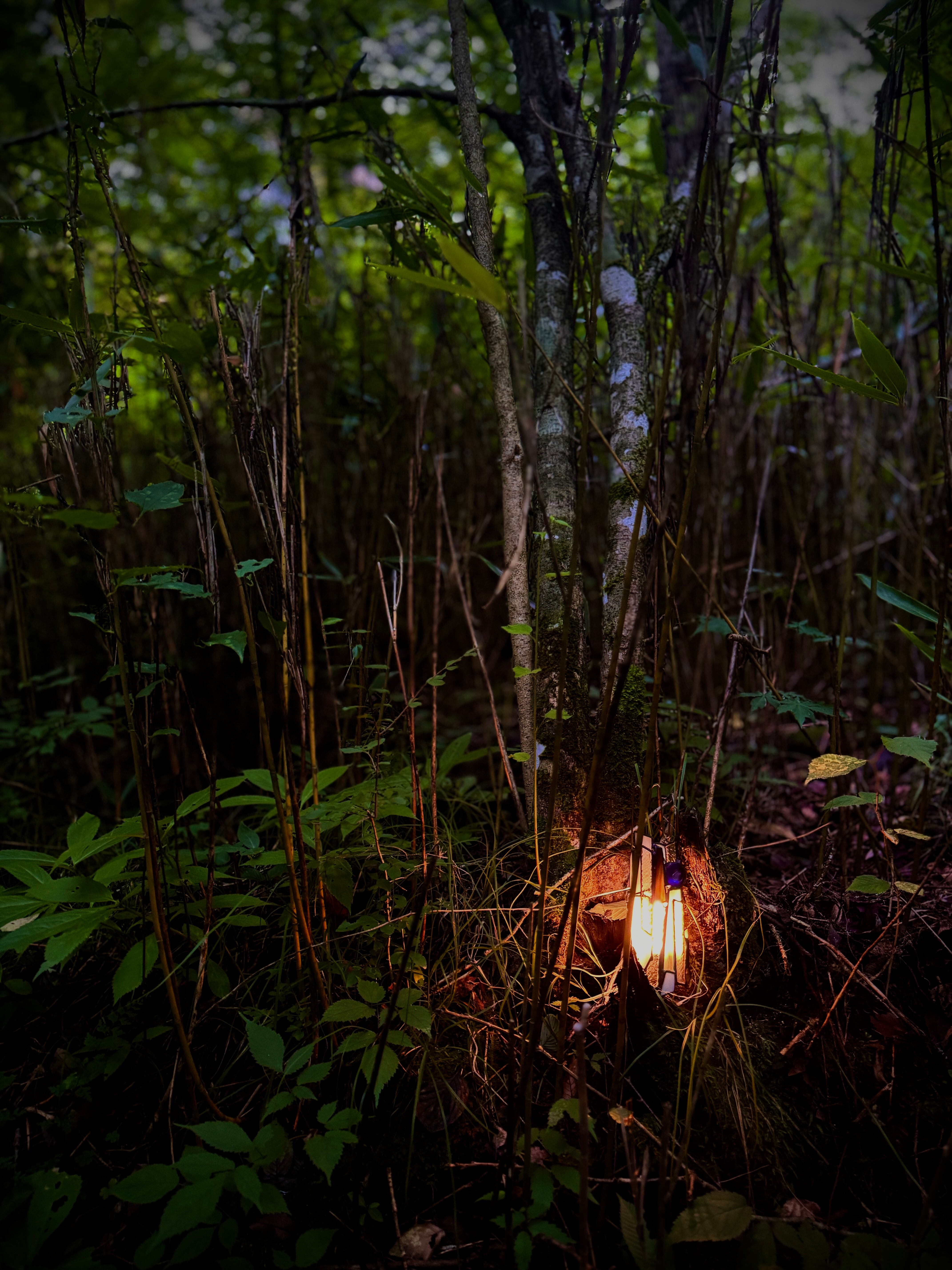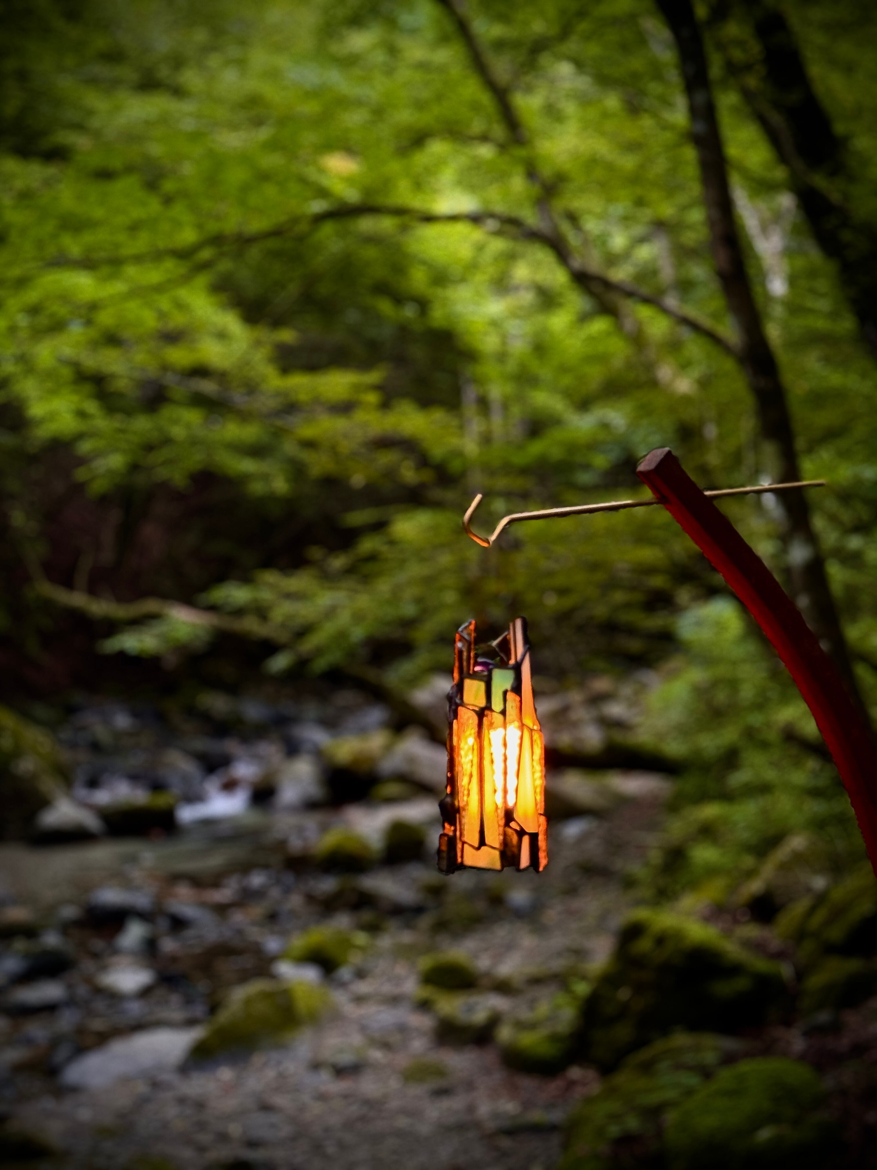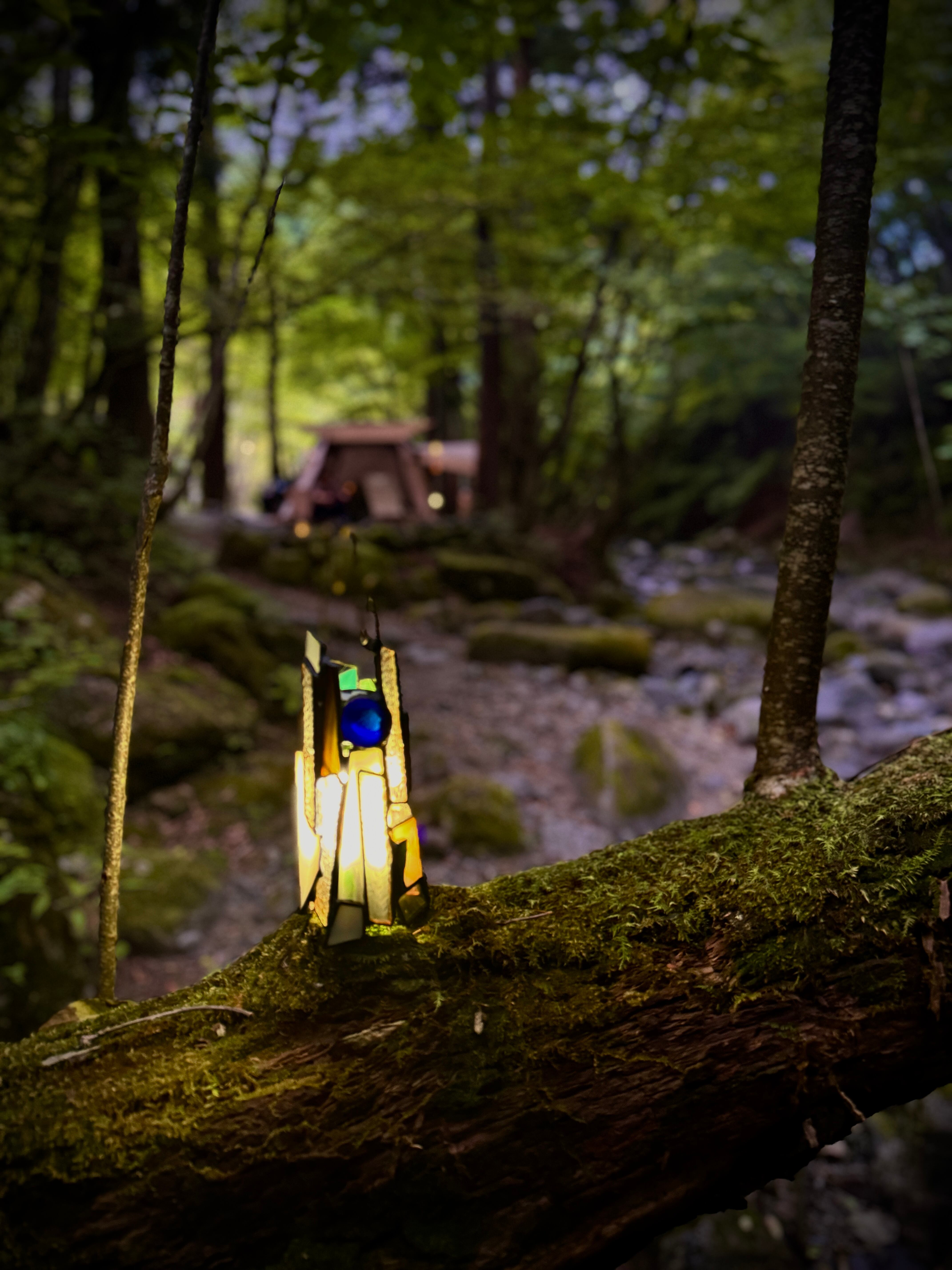 タイトルとは正反対に、ライトを入れるとビシッと格好よく野の中で仁王立ちしてくれます。縦のラインが特徴的なので、竹林やススキなどの中に置くとさらに良い雰囲気を出してくれるかと思います。ぜひ、このランタンを愛でながら、焚き火中華鍋で作った青椒肉絲を食べてみてください♩