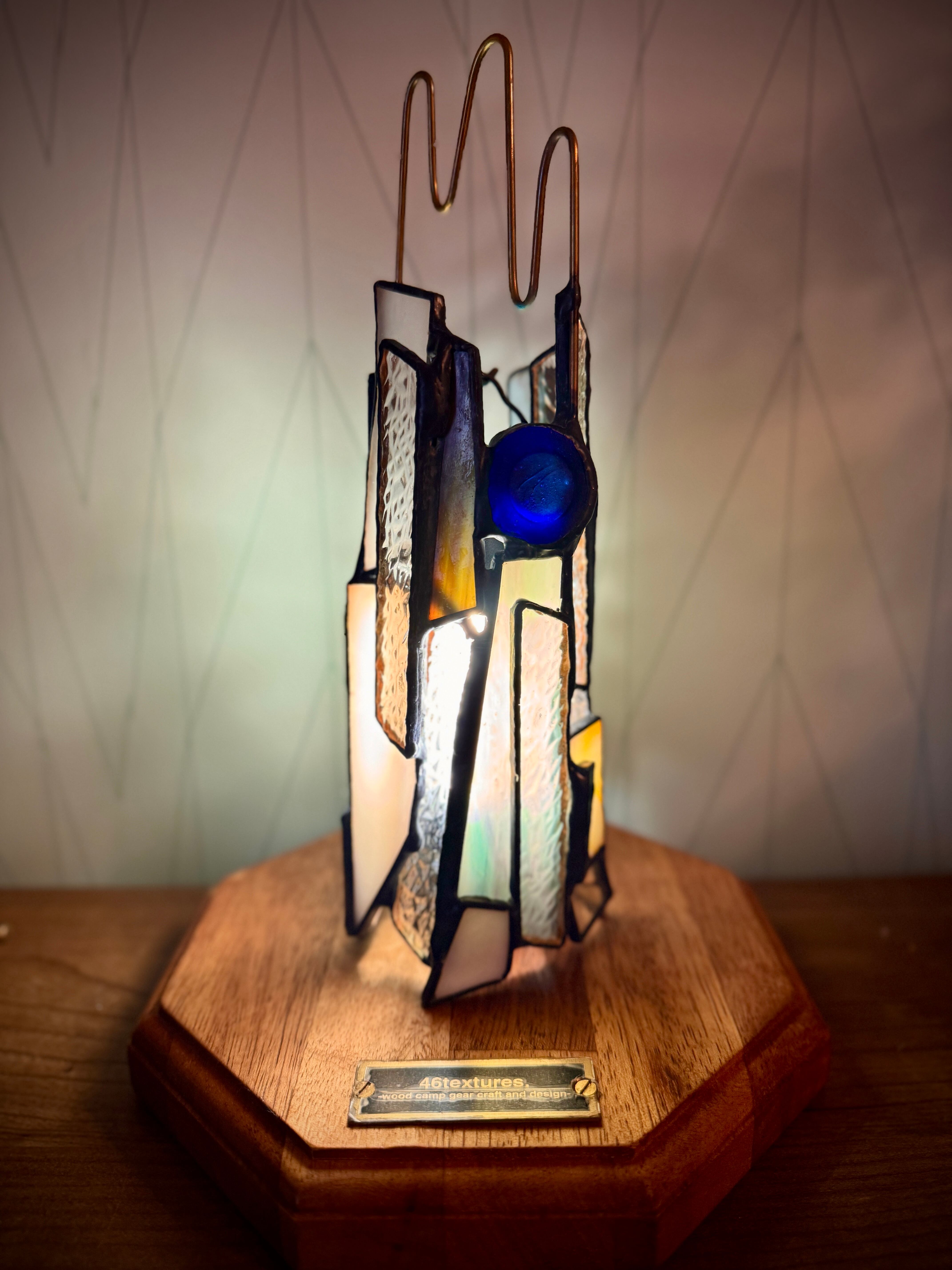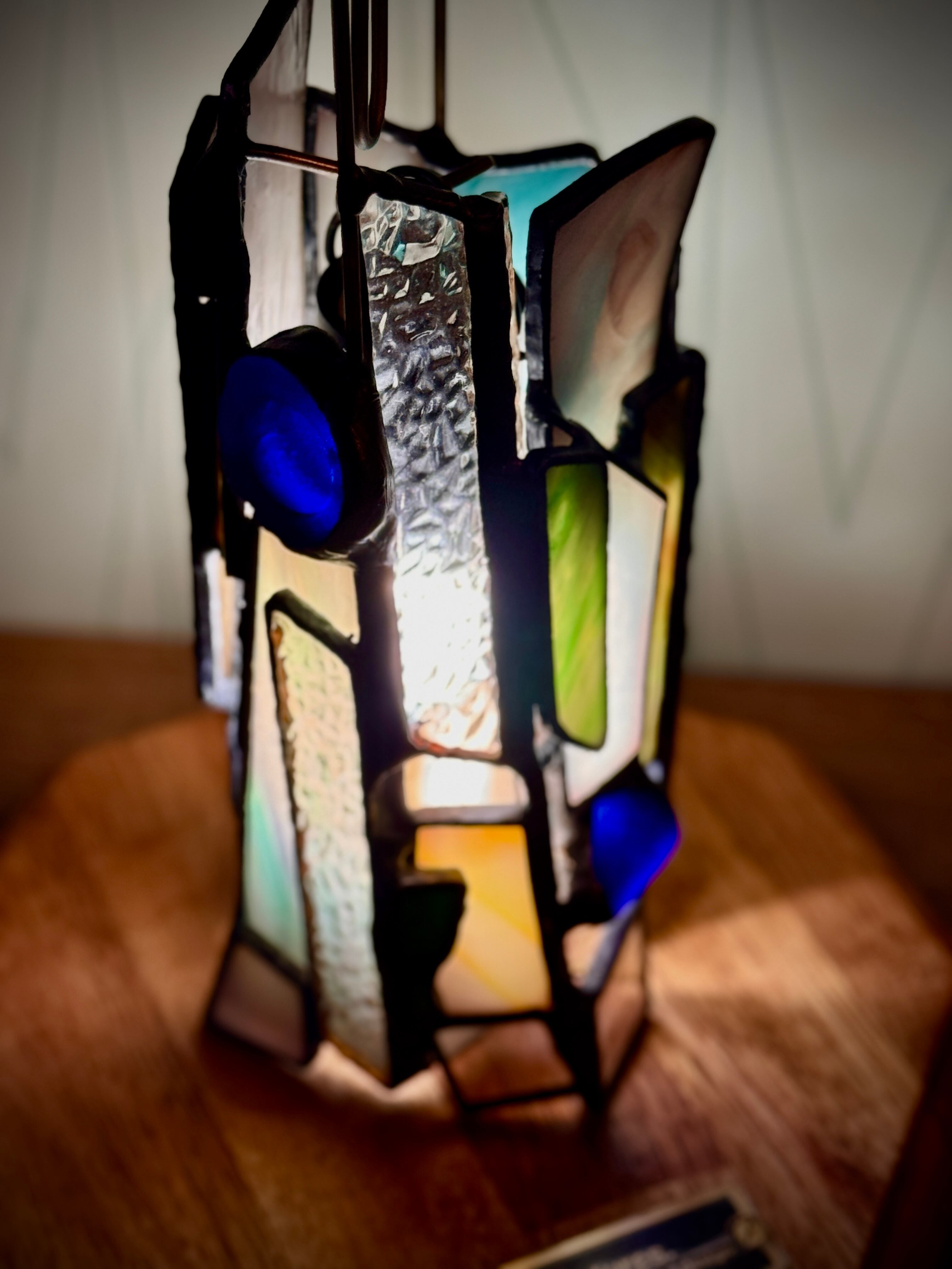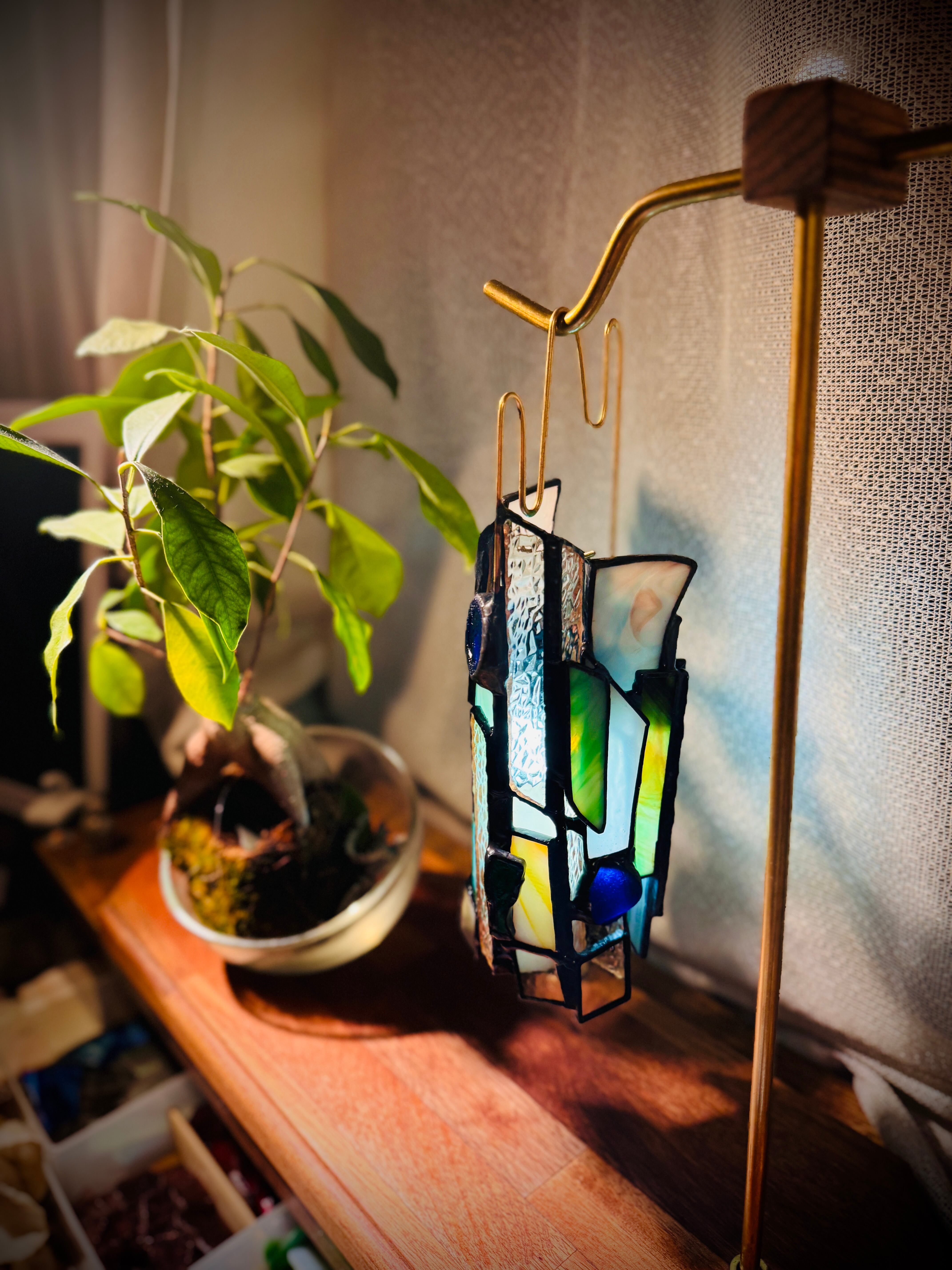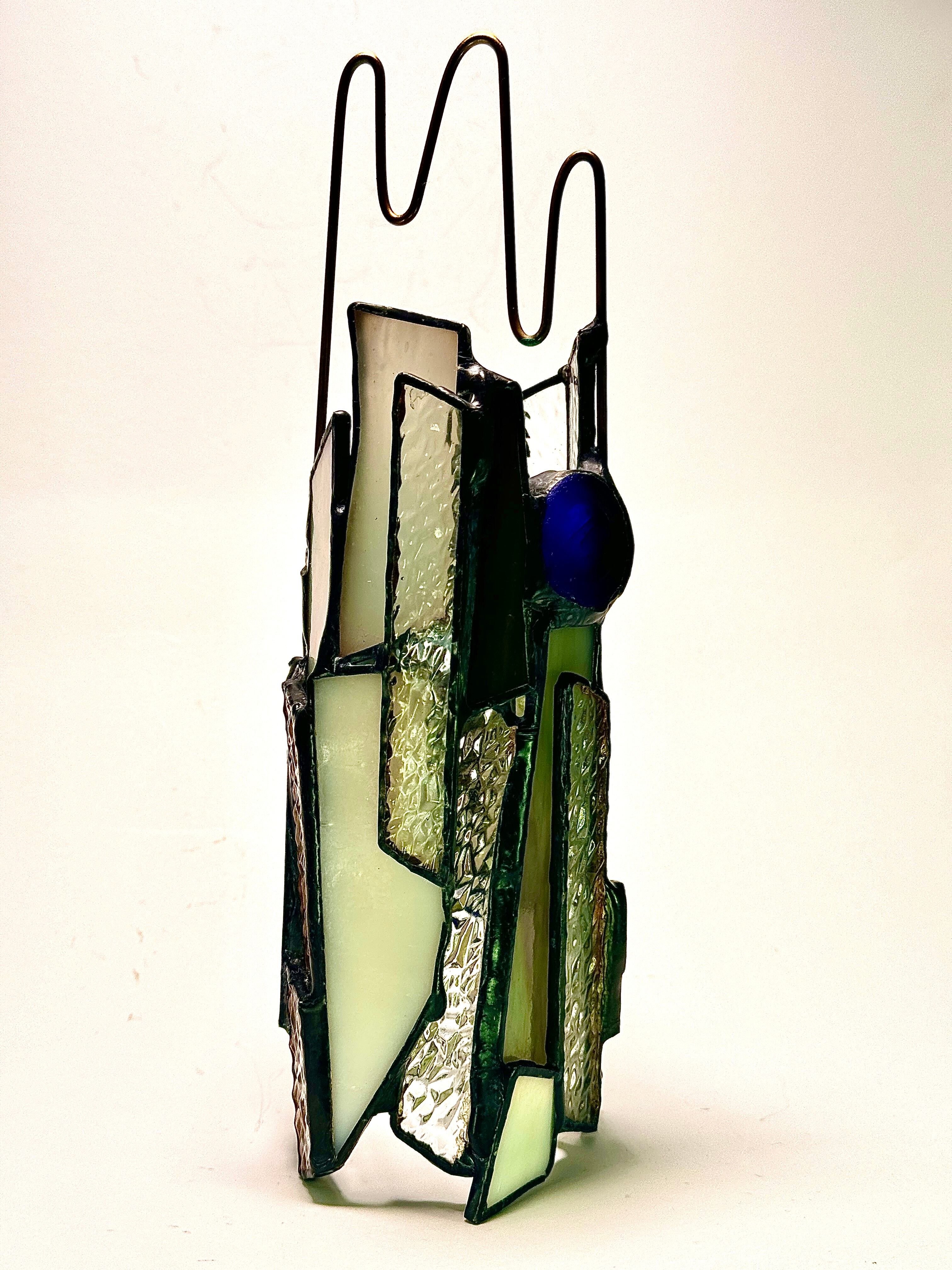 イカは全体的にフォルムと大きな青い目。墨はブラックパティーナでのハンダの加工。女王はてっぺんの真鍮棒で表現した王冠。そして、問題は青椒肉絲。これはガラスのほとんどが細長いもので組み上げていることと、この日の夕飯に青椒肉絲を私が食べたこと。ただそれだけ。下の方に使っている緑のガラスは、察しの通りピーマンです。いつもは格好つけたタイトルが多いですが、たまにはこういうのも良いかなと。
