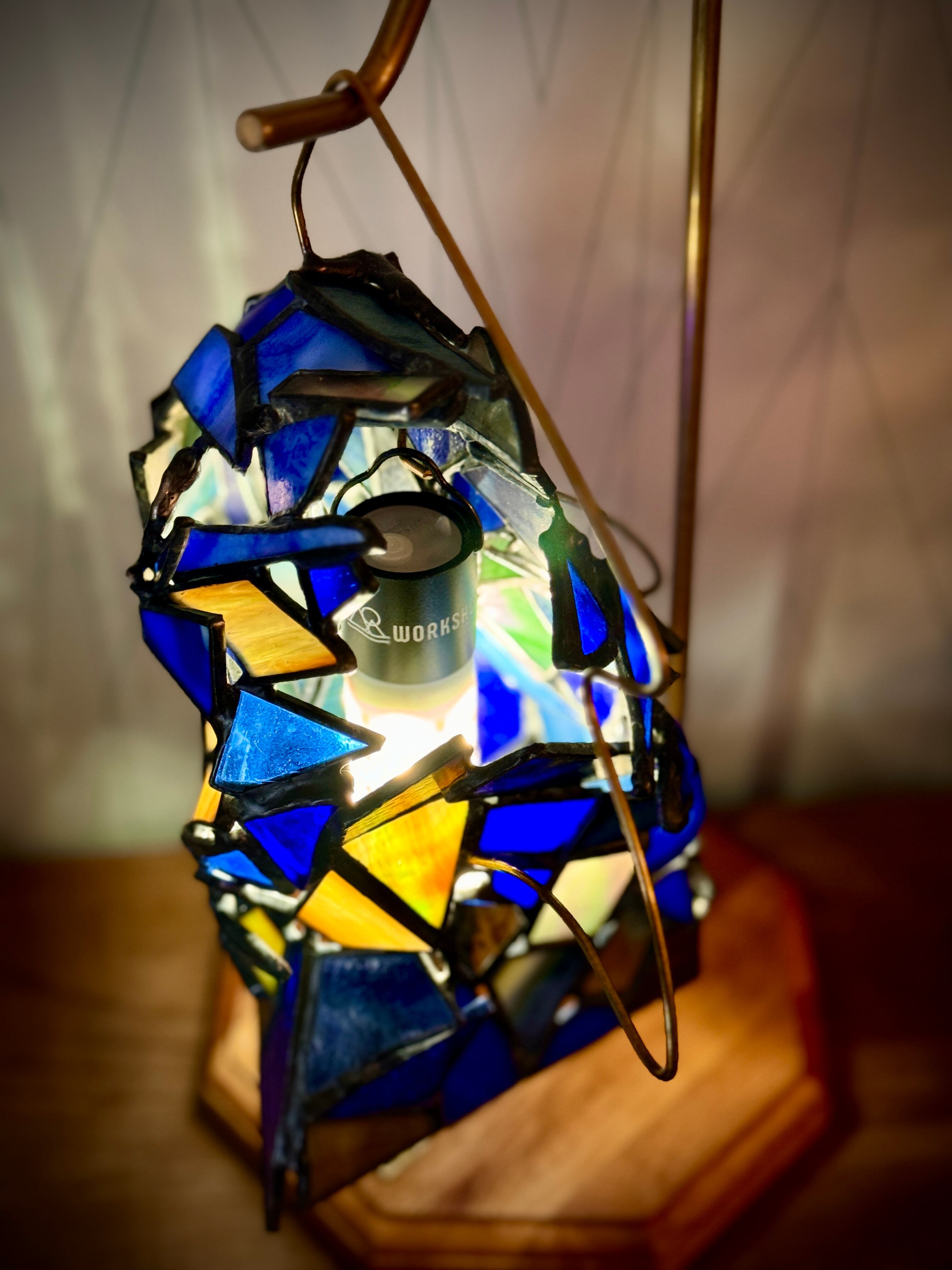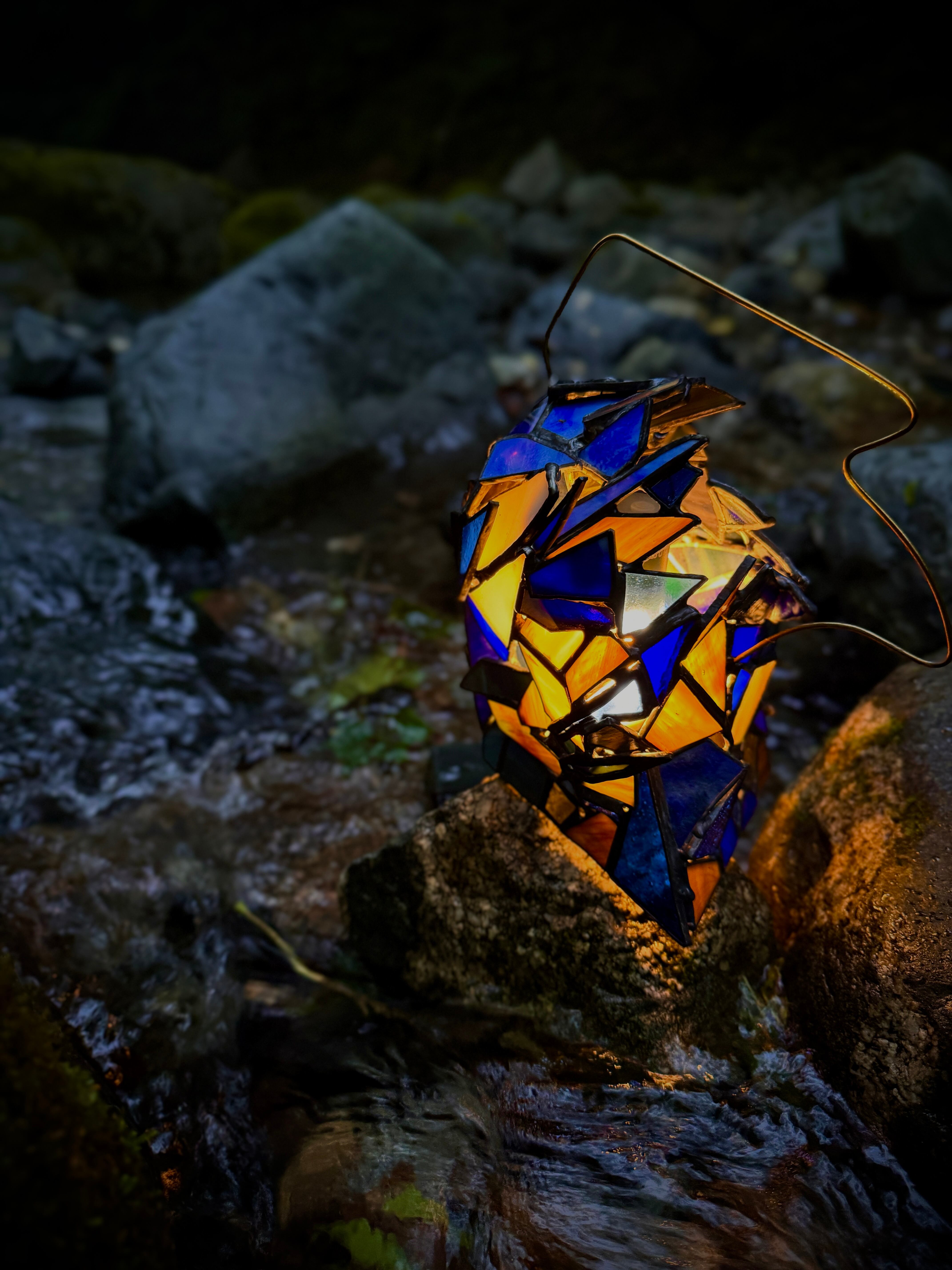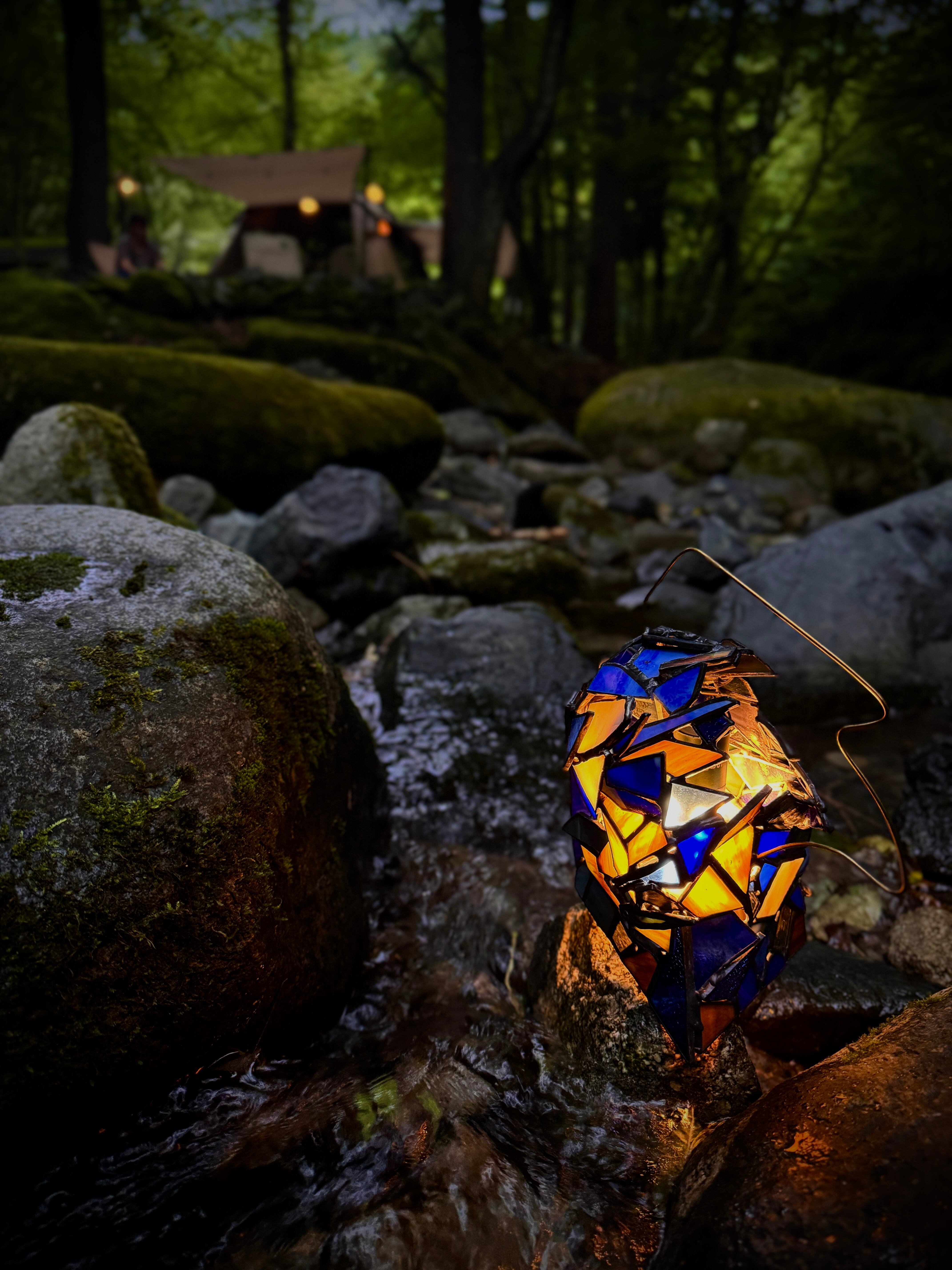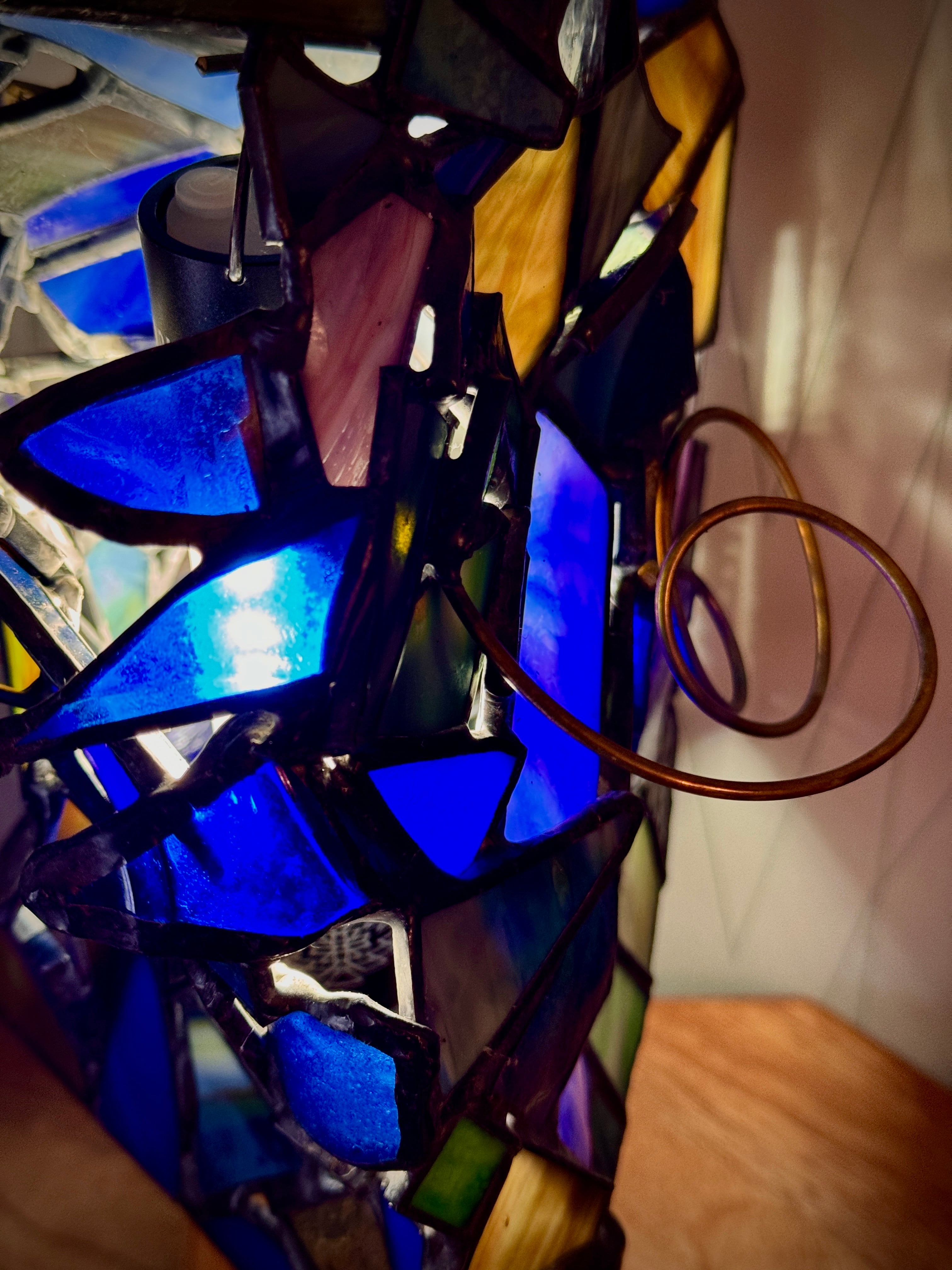 ライトを入れる前は、青い印象が強いですが、所々に繋げてある縞模様のガラスは灯りを入れると写真のように黄色っぽく光ります。