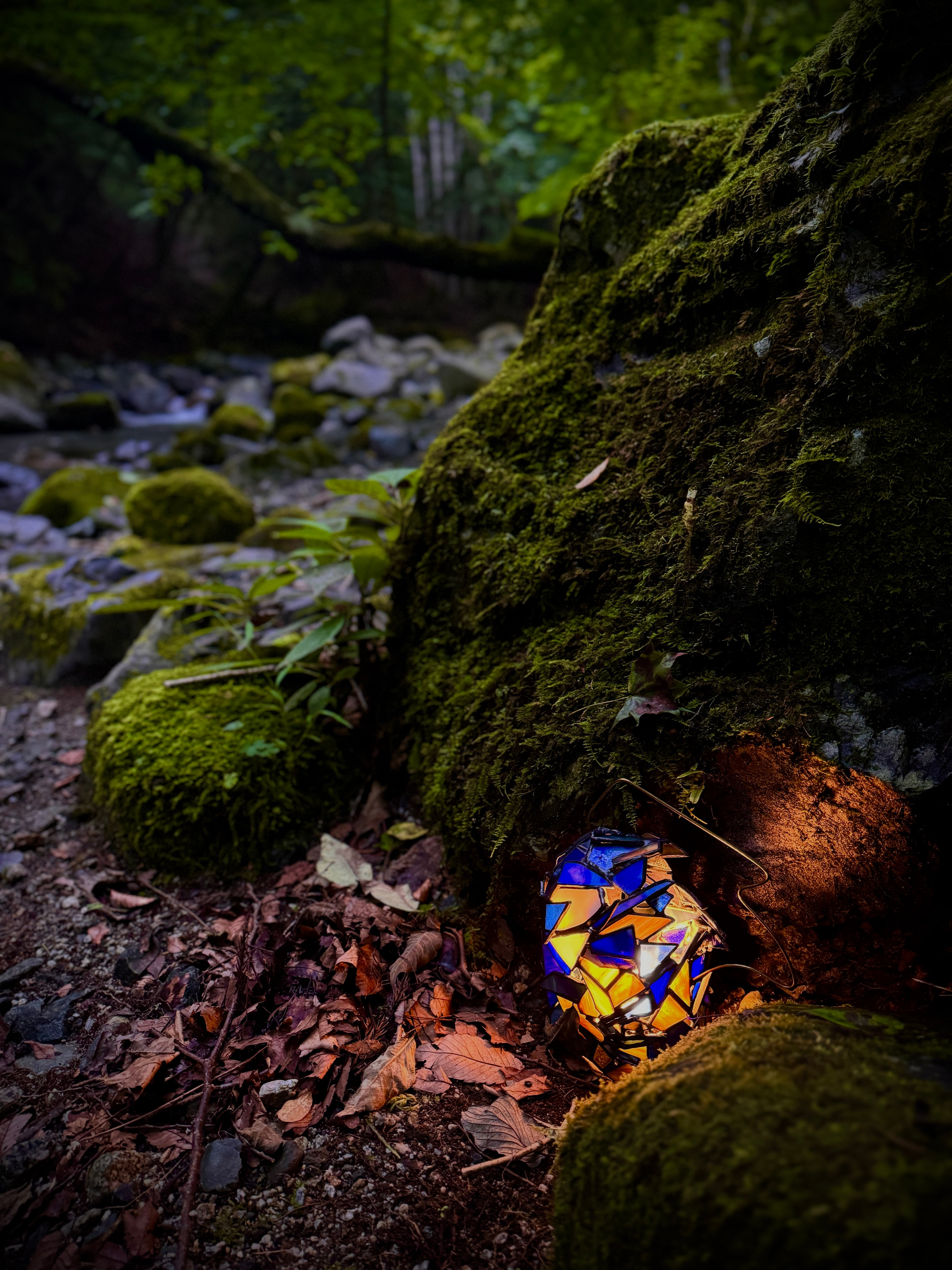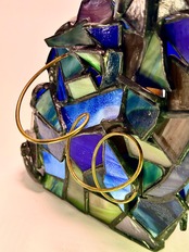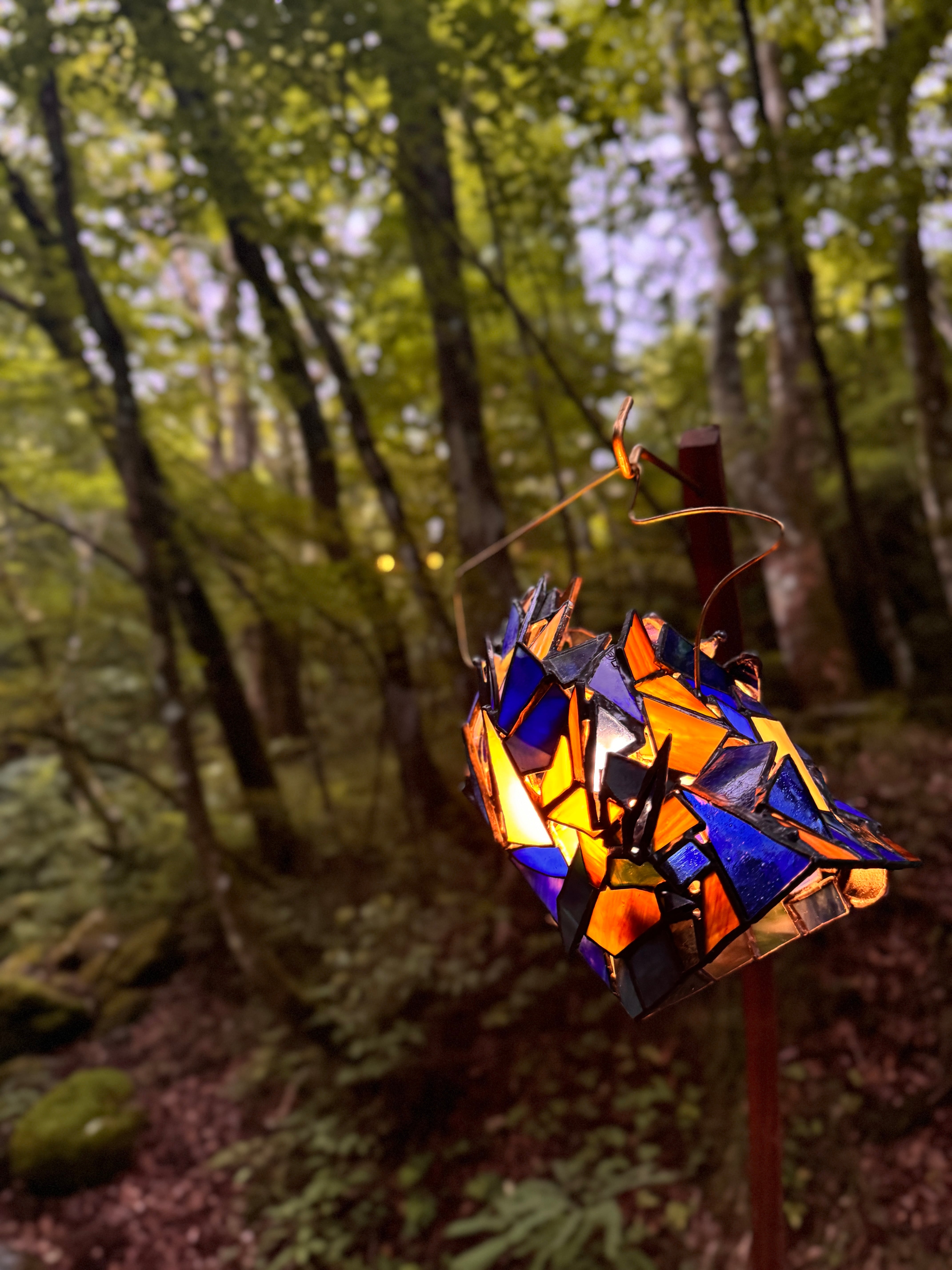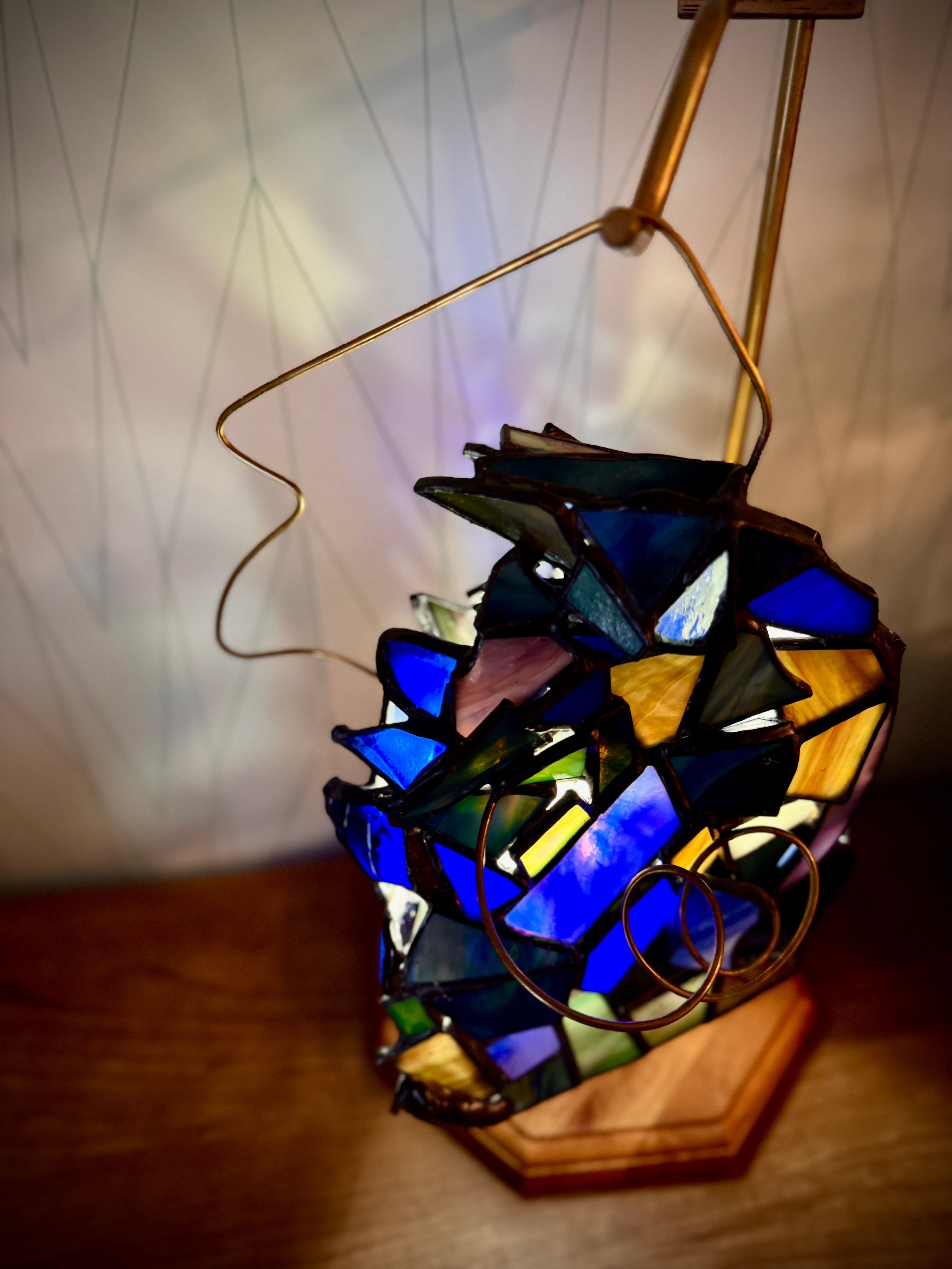 ライトを入れる前は、青い印象が強いですが、所々に繋げてある縞模様のガラスは灯りを入れると写真のように黄色っぽく光ります。