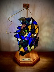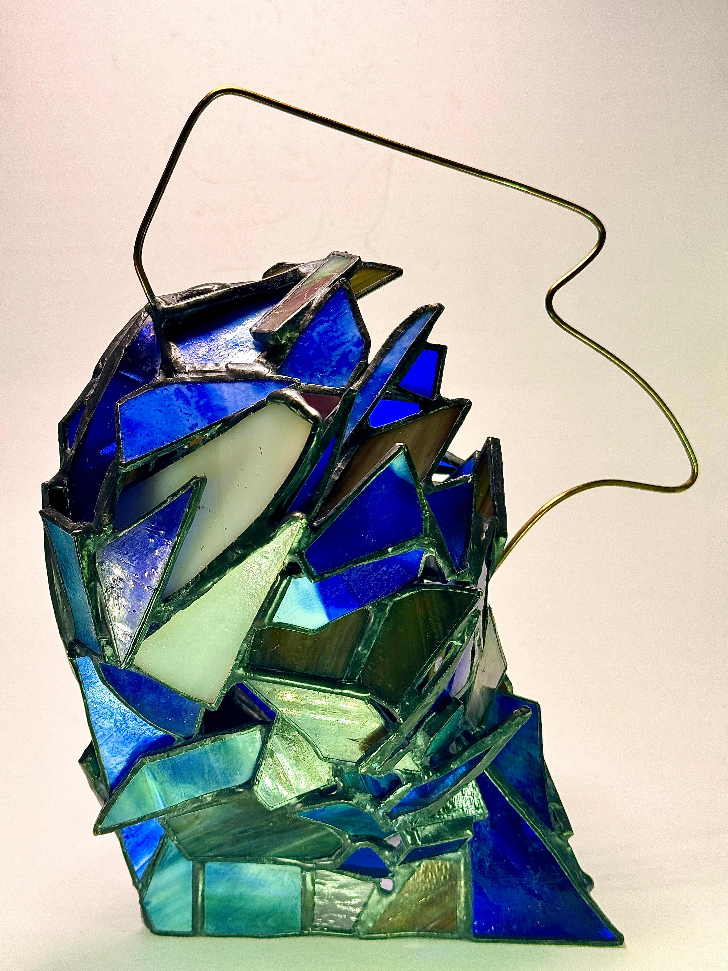 ストレスを感じてしまうガザガザした心地の悪さを、ガラスの攻撃的な向きと真鍮ハンドルの変な形で表しました。「社会(うねりと読む)の中でも上手にやっていけるはずさ」と、自分への期待も込めてステンドグラスの力でカッコつけました。