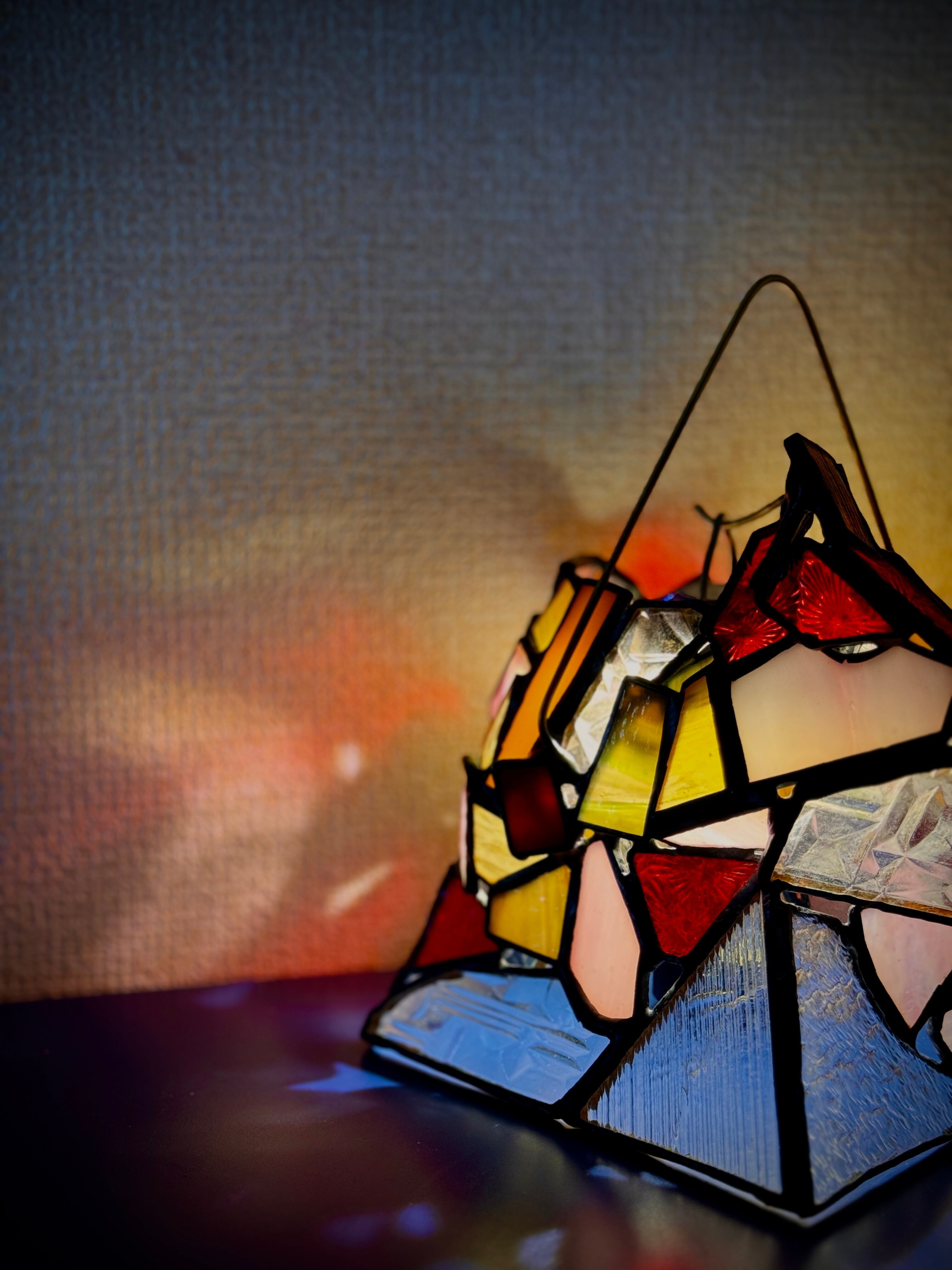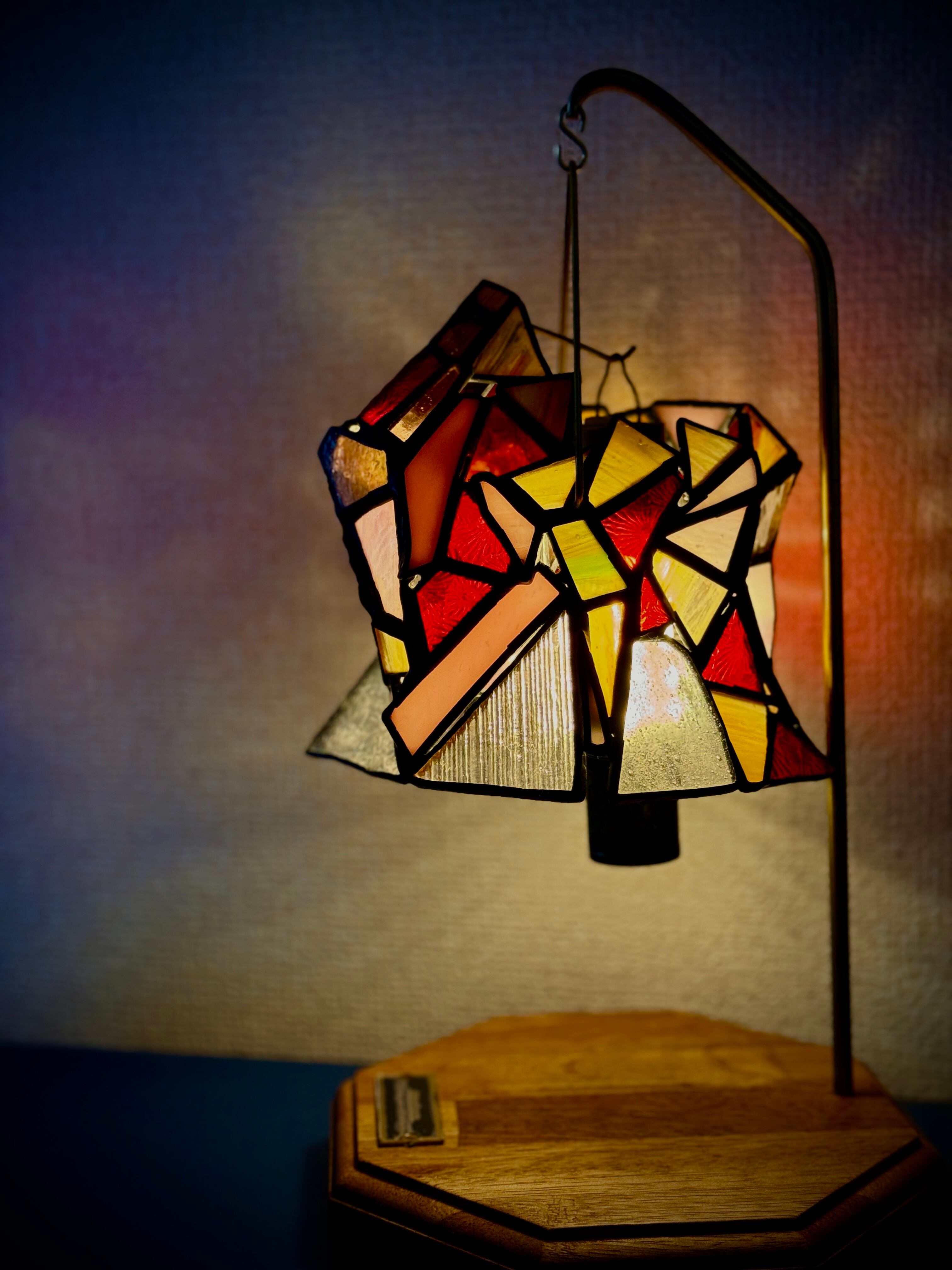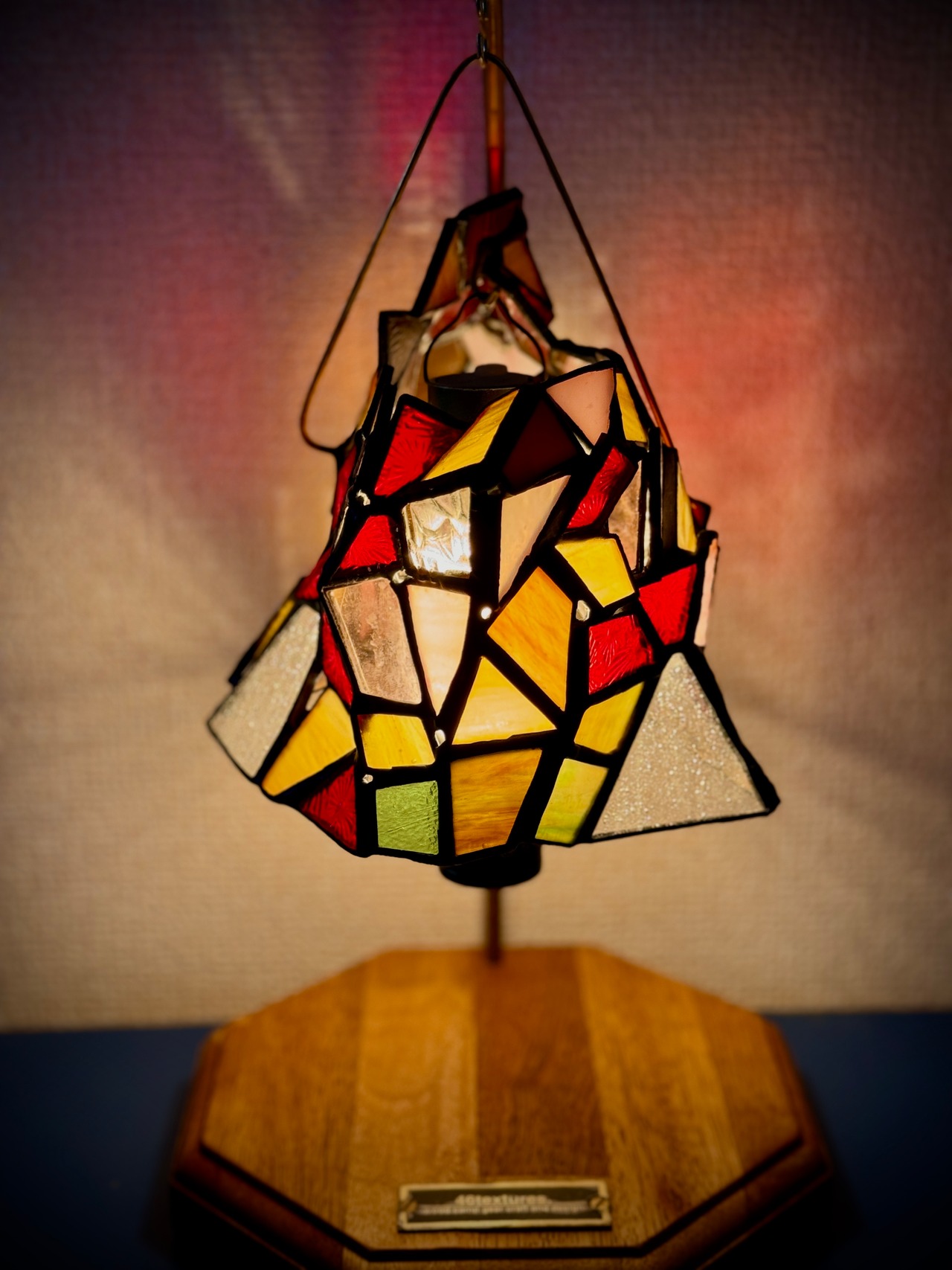 それならと、ザ・ステンドグラスという感じでハンダも黒のパティーナで力強く仕上げました。はんなり灯る和な雰囲気のシェードをぜひ優しい夜に灯してみてください。