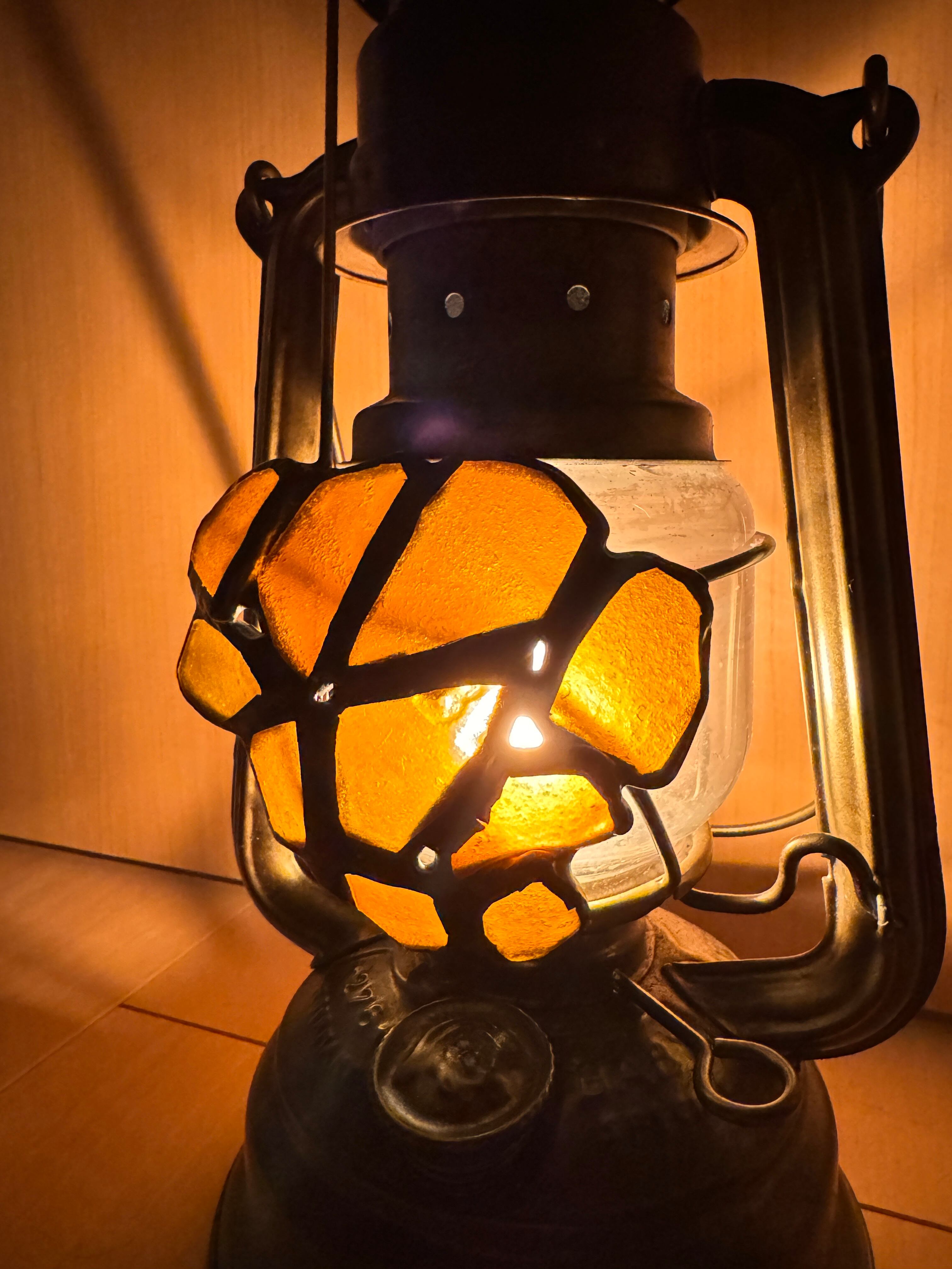 ・ハリケーンランタンのてっぺんに引っ掛けて、ホヤを煽って小さな炎をシーグラスに透かして楽しむ。