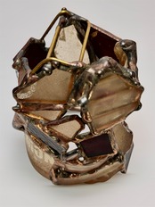 レッドレンザーML4用のシェードですが、なかなか重厚です。タイトルにあるサイコは、多重人格的な内面の複雑さを表してます。そして、"セロシア"は一般的に"ケイトウ"と呼ばれる炎の形のような花です。そのドライフラワーを1つぼみガラスの中に閉じ込めました。内なる炎や花の一面を隠したり見せたりする、サイコな部分は誰にでもあるかと思います。そしてそれは、自分だけしかわからなかったり、逆に他人にしか伝わらなかったりもします。そんな理解しづらい内面をランタンにしてみました。濁った透明のガラスは少し模様の入ったシーグラスを使いました。セロシアの花を光で透かしたり、濁る透明な灯りをぼんやり楽しんだりしてもらえたら、FEVER!です。